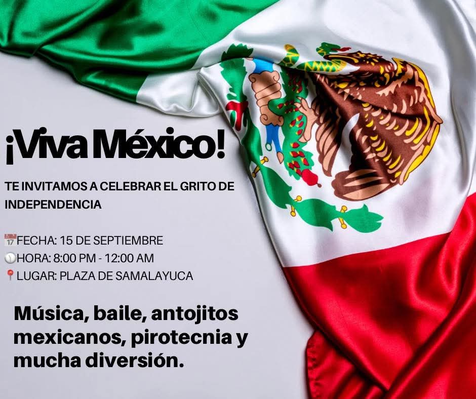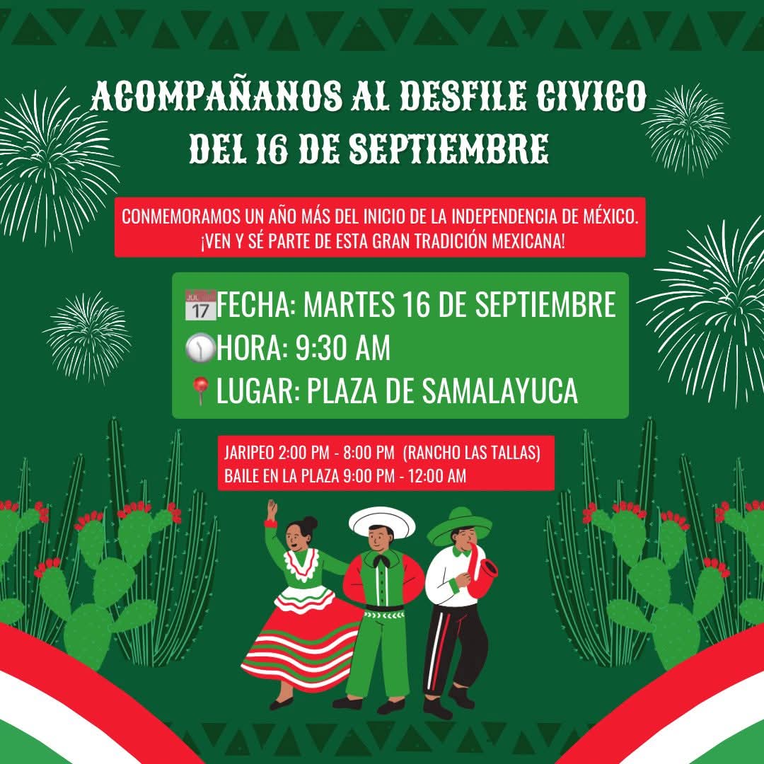 La Presidencia Seccional de Samalayuca invita a la comunidad fronteriza a su celebración del Grito de Independencia, así como al desfile cívico este 15 y 16 de septiembre, respectivamente para celebrar el 215 aniversario del inicio de la lucha de independencia.