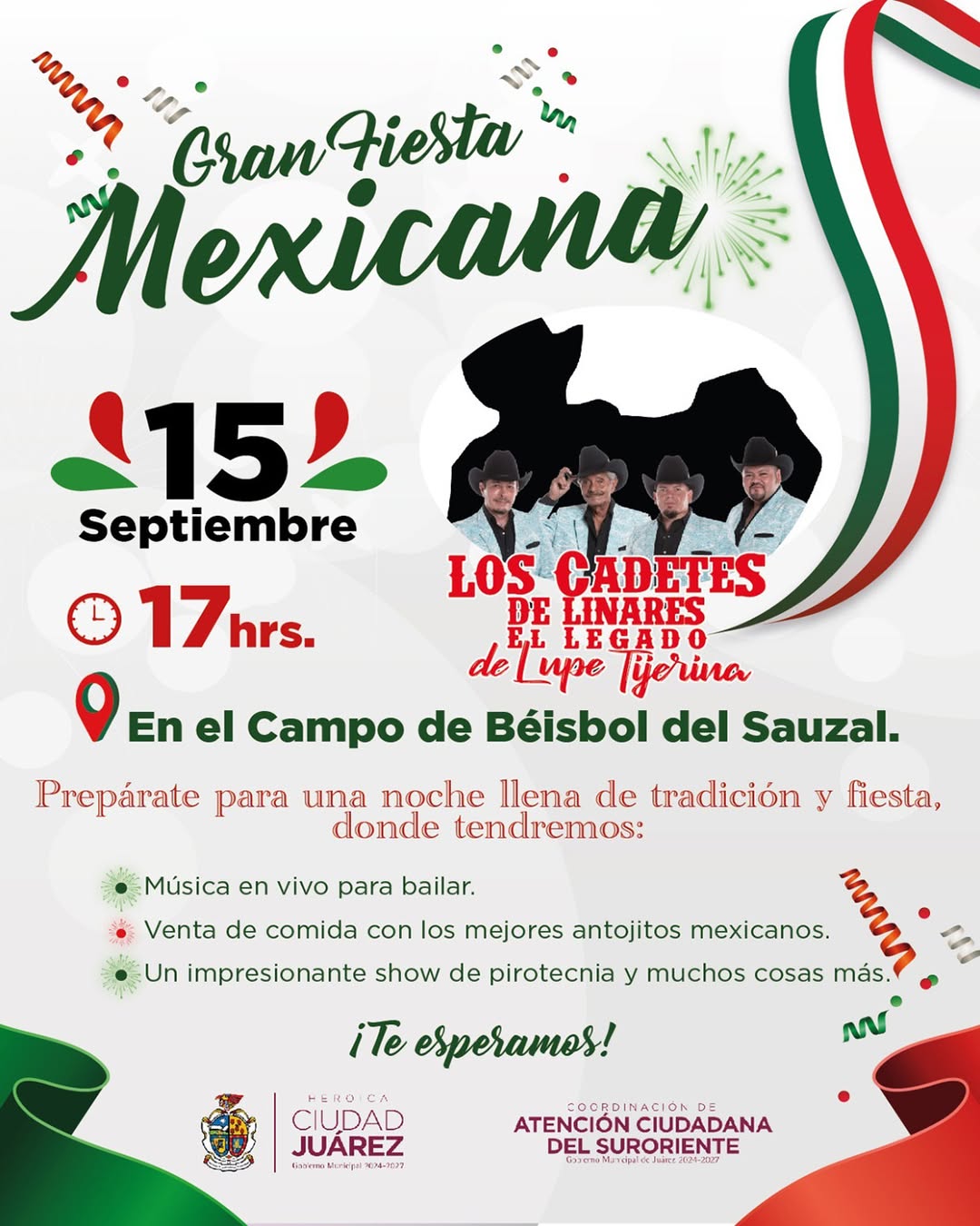 El Gobierno Municipal a través de la Coordinación de Atención Ciudadana del Suroriente, invita a la comunidad a la Gran Fiesta Mexicana que tendrá lugar en El Sauzal hoy lunes 15 de septiembre.