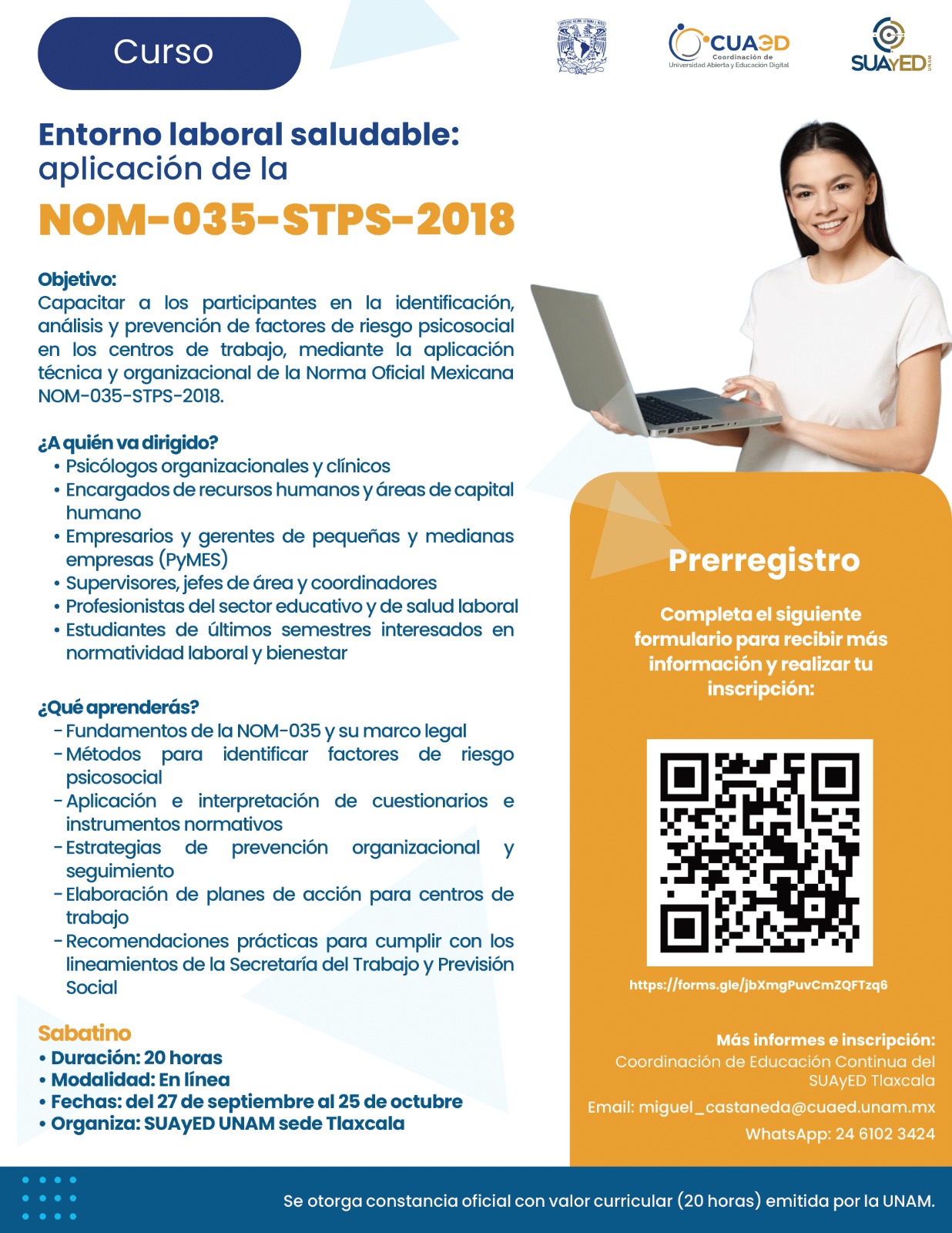 La Universidad Nacional Autónoma de México (UNAM), a través del Sistema Universidad Abierta y Educación a Distancia (SUAyED), sede Tlaxcala, invita al público en general, así como a profesionales del ámbito laboral, educativo y de la salud, a participar en el curso en línea titulado “Entorno laboral saludable, aplicación de la NOM-035-STPS-2018”, el cual forma parte de la oferta de Educación Continua que dicha sede universitaria pone a disposición de quienes buscan fortalecer sus conocimientos y competencias en temas de bienestar laboral.