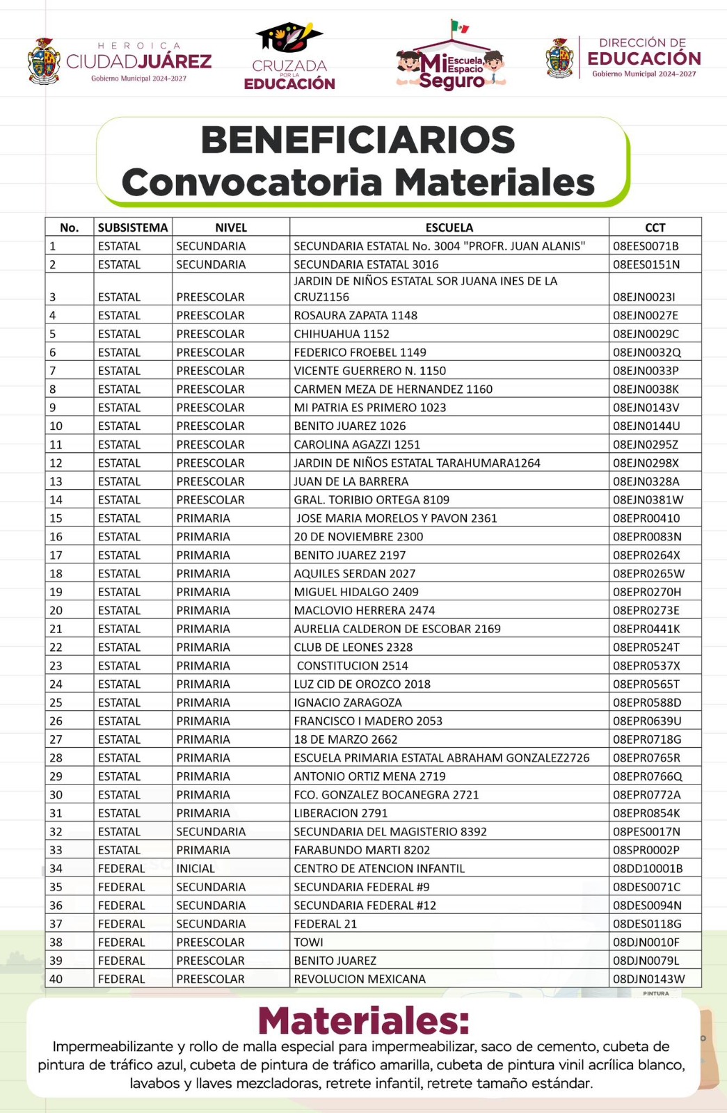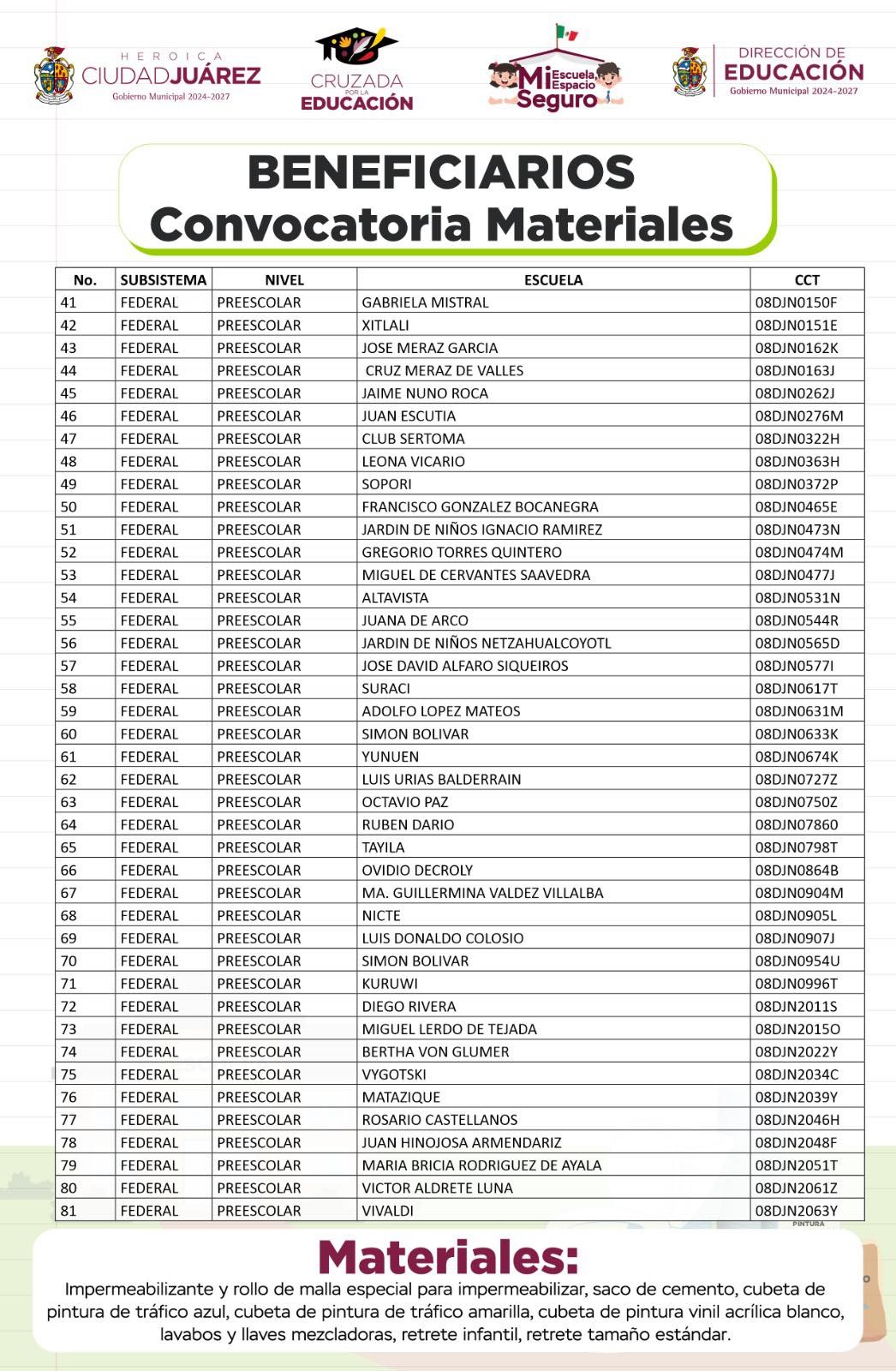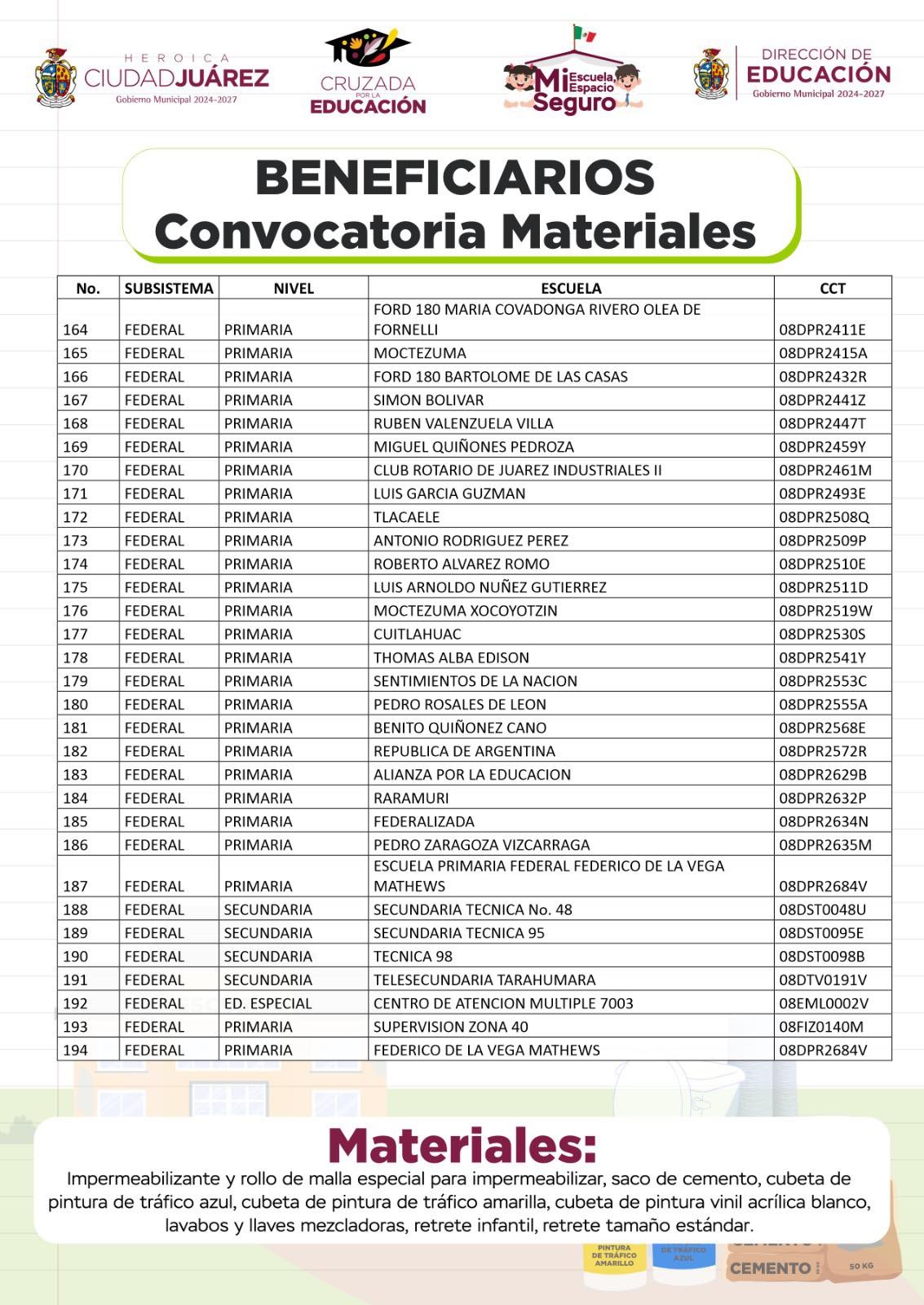 Guillermo Alvídrez Olivas, titular de la dependencia, dio a conocer que las escuelas que resultaron beneficiadas con la convocatoria recibirán material como: impermeabilizantes y rollos de malla, sacos de cemento, cubetas de pintura de tráfico azul o amarilla, cubetas de pintura vinil acrílica blanca, lavabos y llaves mezcladoras, retretes infantiles y retretes tamaño estándar.