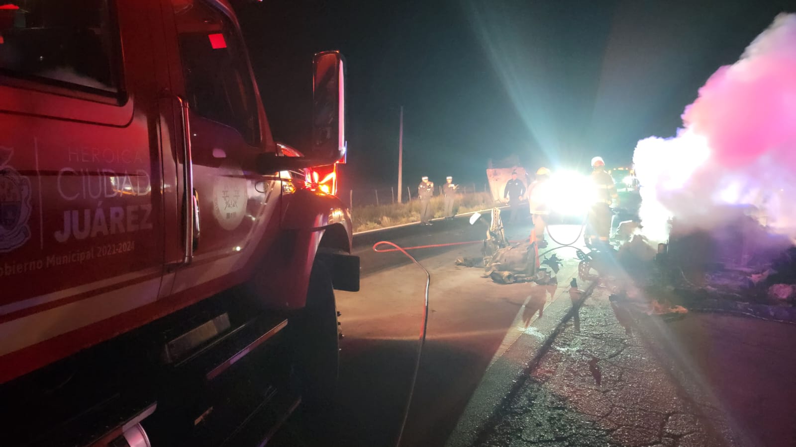 Durante la madrugada, personal de la Dirección General de Protección Civil y del Departamento de Bomberos acudió al kilómetro 293+900 de la carretera Chihuahua–Ciudad Juárez, donde se reportó el incendio de un tractocamión.