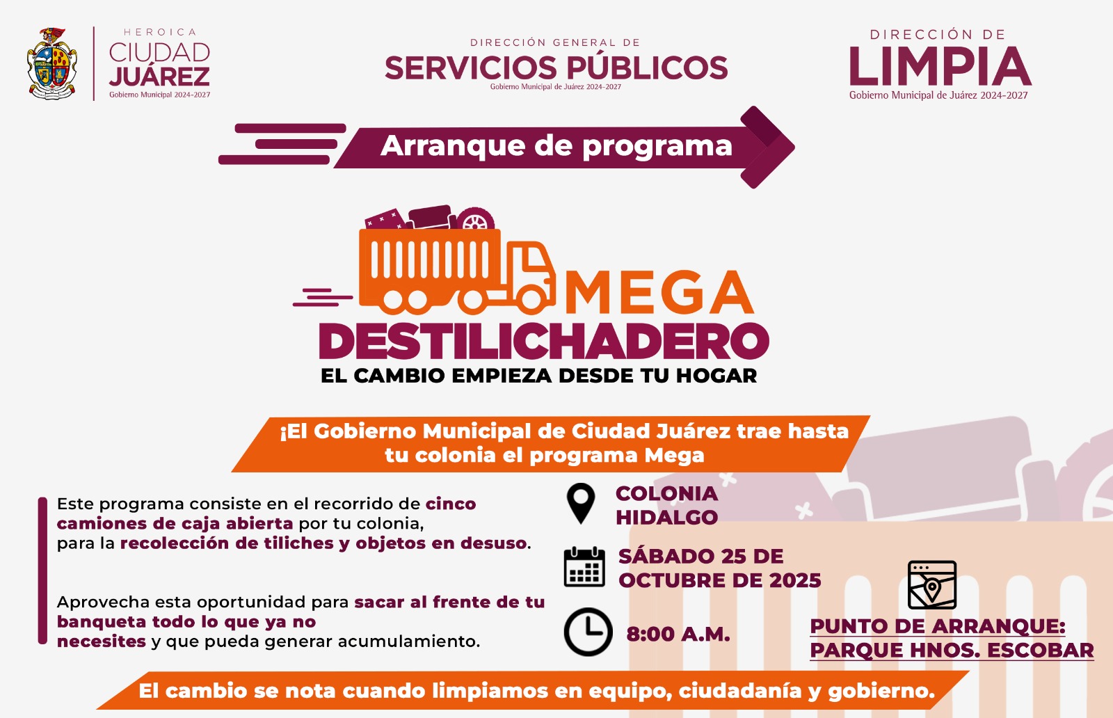 La Dirección de Limpia, dependiente de la Dirección General de Servicios Públicos, se encuentra lista para poner en marcha el nuevo programa mega destilichadero, encabezado por el Presidente Municipal, Cruz Pérez Cuéllar, que se llevará a cabo mañana sábado en las colonias Hidalgo y Américas.