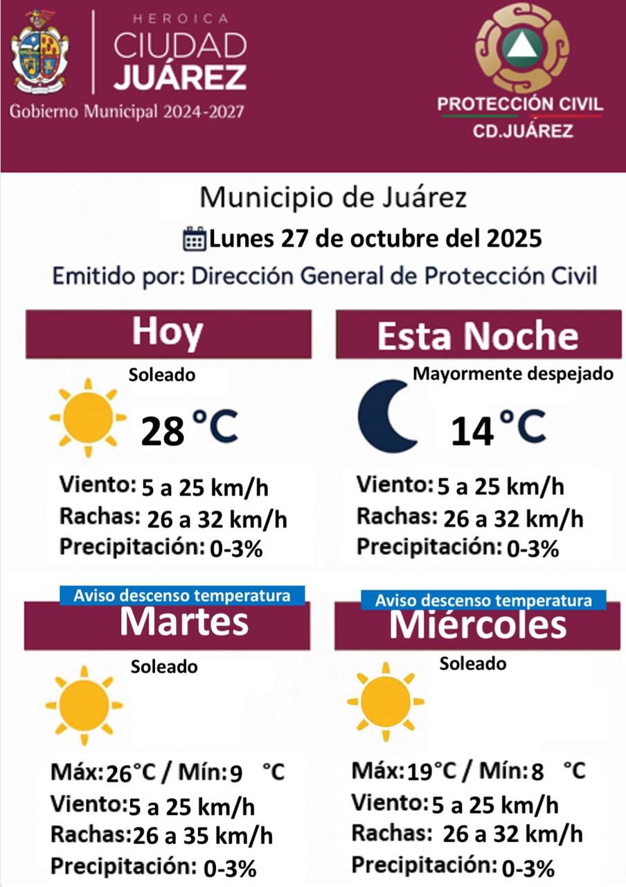 La Dirección General de Protección Civil del Municipio informó que este lunes 27 de octubre de 2025 se mantendrá un clima soleado, con una temperatura máxima de 28 °C y vientos de entre 5 y 25 kilómetros por hora, con rachas que alcanzarán los 32 km/h. La probabilidad de precipitación es mínima, de entre 0 y 3 %.