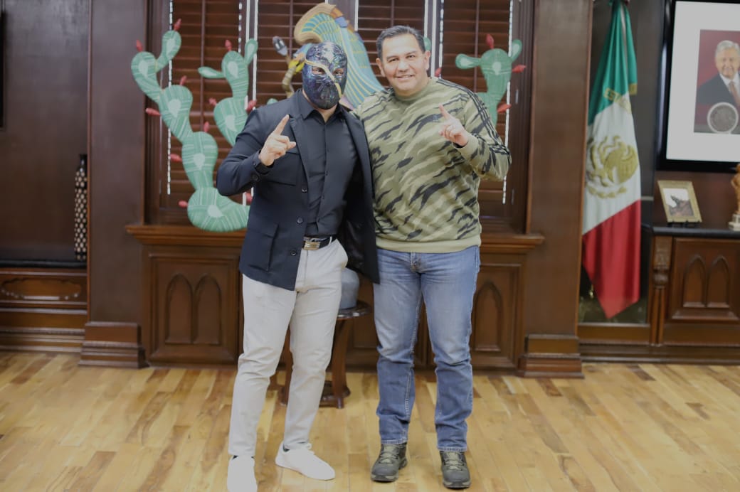 El luchador profesional Cinta de Oro se entrevistó este día con el Presidente Municipal, Cruz Pérez Cuéllar, para presentarle detalles sobre su libro.