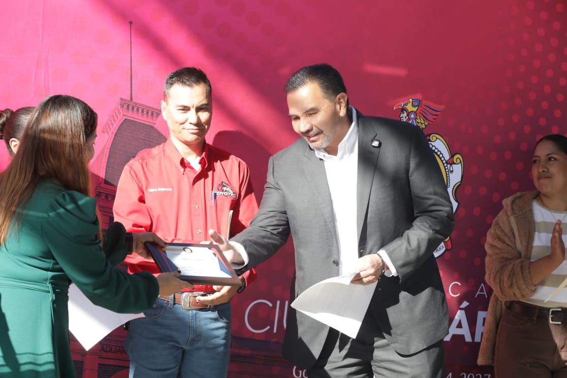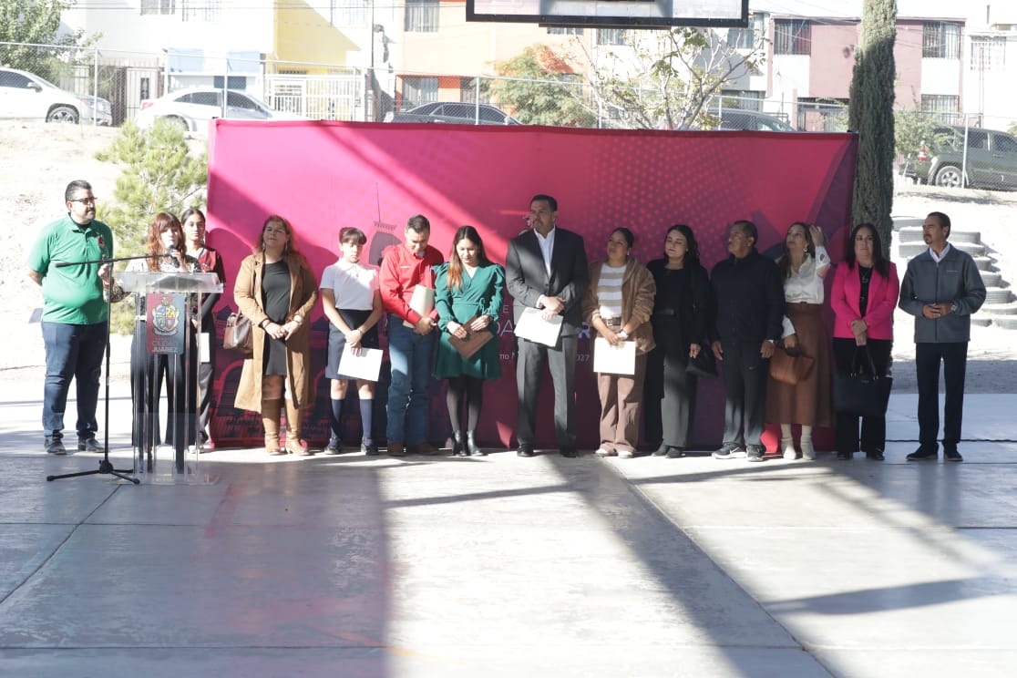 En la ceremonia de entrega acompañaron al alcalde el director de Educación, Guillermo Alvídrez; el titular de Infraestructura Educativa del Municipio, Ismael Rueda; el director de Participación Ciudadana, Sebastián Aguilera y el regidor Jorge Marcial Bueno Quiroz, así como los maestros Azucena Alfaro, Violeta Gama, Edith Becerra, Araceli Moreno, Manuel Hernández y Antelmo Bejarano.