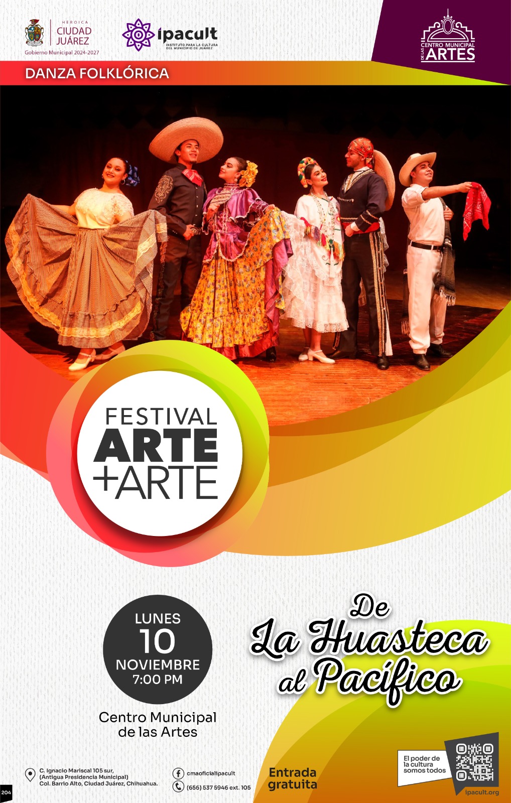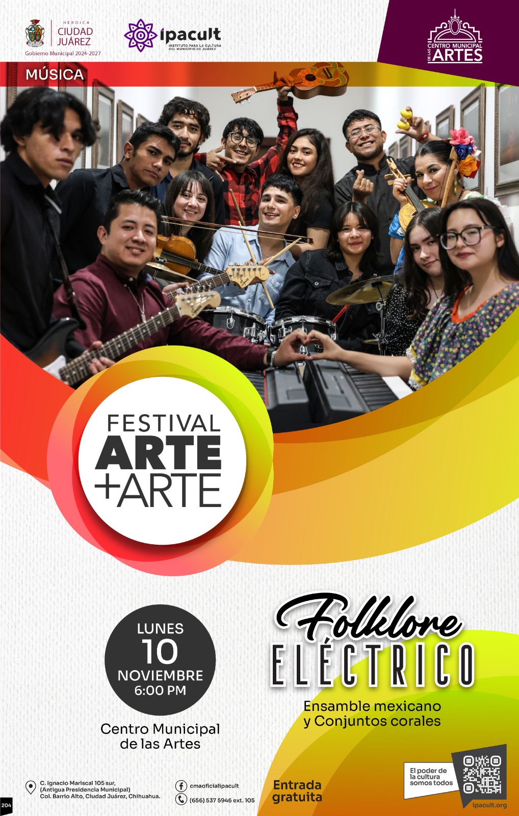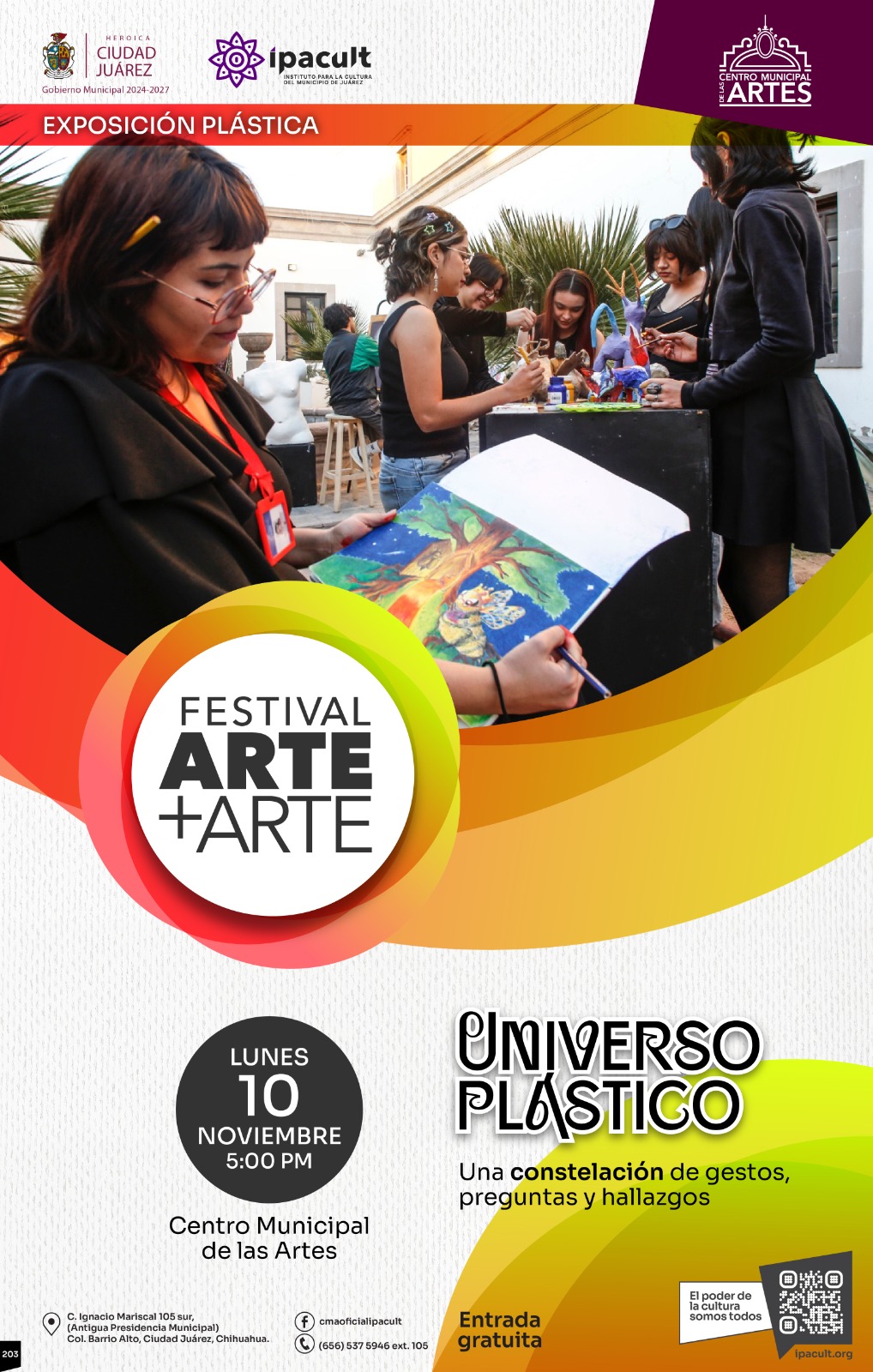 El Instituto para la Cultura del Municipio de Juárez (IPACULT) invita a la comunidad juarense a disfrutar del Festival Arte+Arte, que arranca este lunes 10 de noviembre y se extenderá hasta el viernes 14, en las instalaciones del Centro Municipal de las Artes (CMA), ubicado en la antigua Presidencia Municipal, detrás de la Catedral de Nuestra Señora de Guadalupe, en el Centro Histórico.