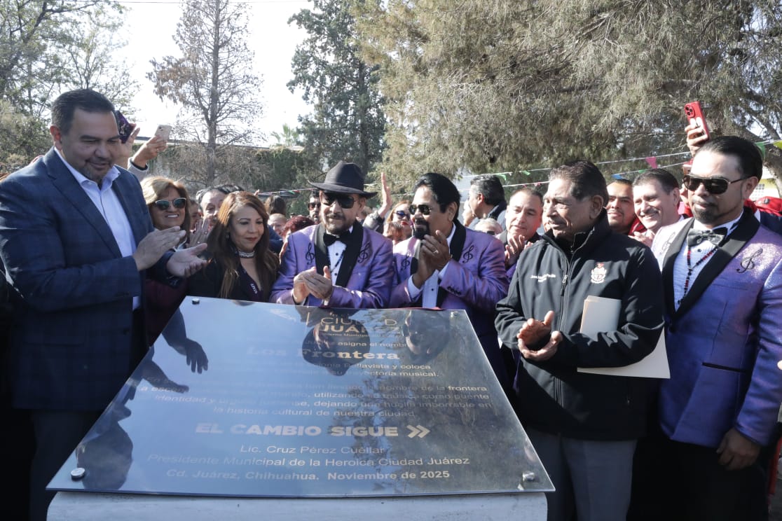 El Presidente Municipal, Cruz Pérez Cuéllar, encabezó la develación de la placa conmemorativa que otorga el nombre “Los Frontera” a un parque de la ciudad, como reconocimiento a la trayectoria de la agrupación juarense con más de cinco décadas de historia musical.