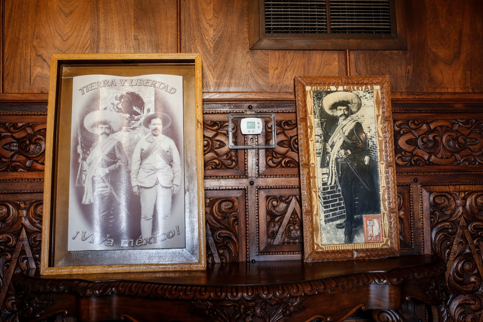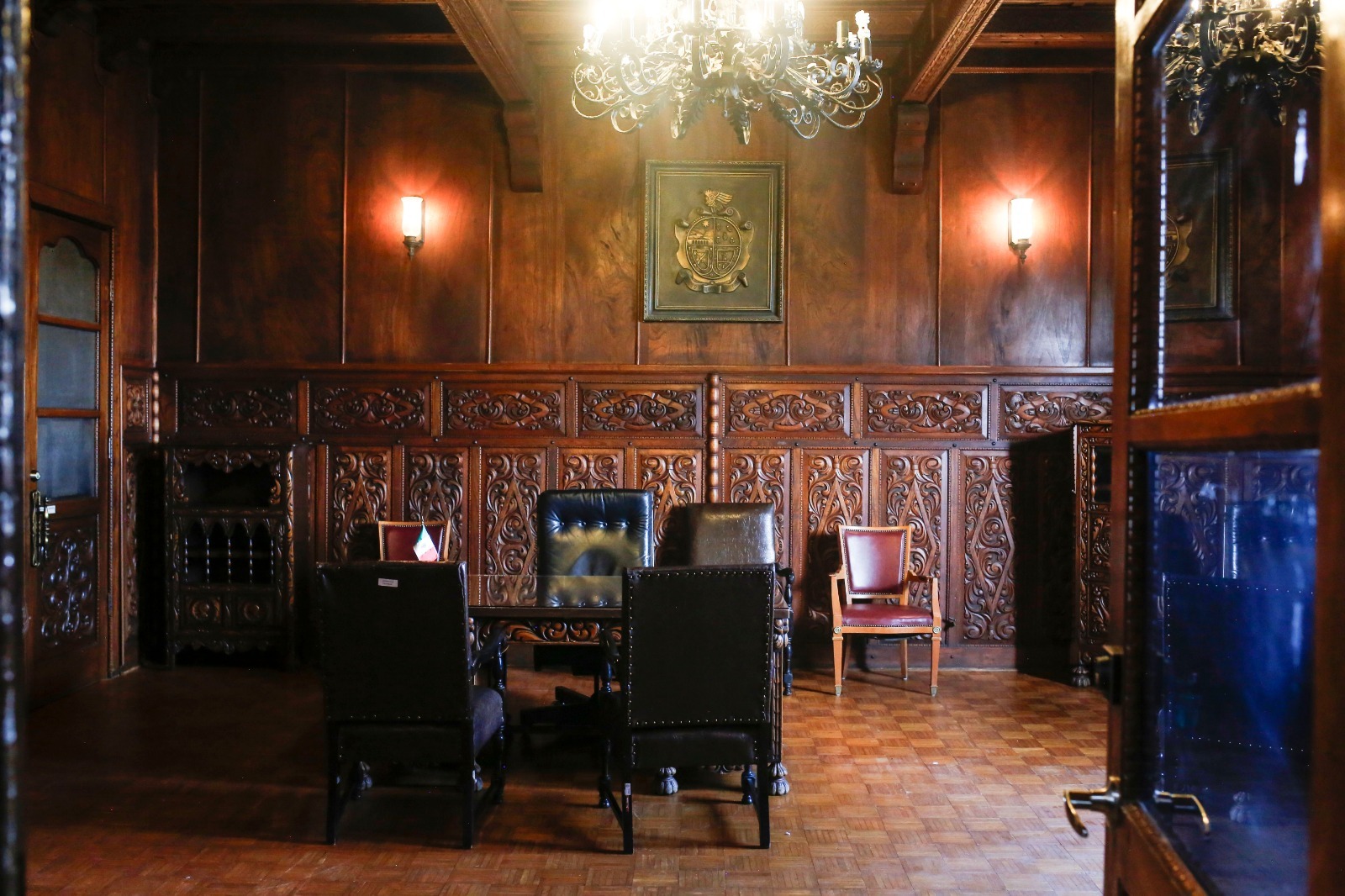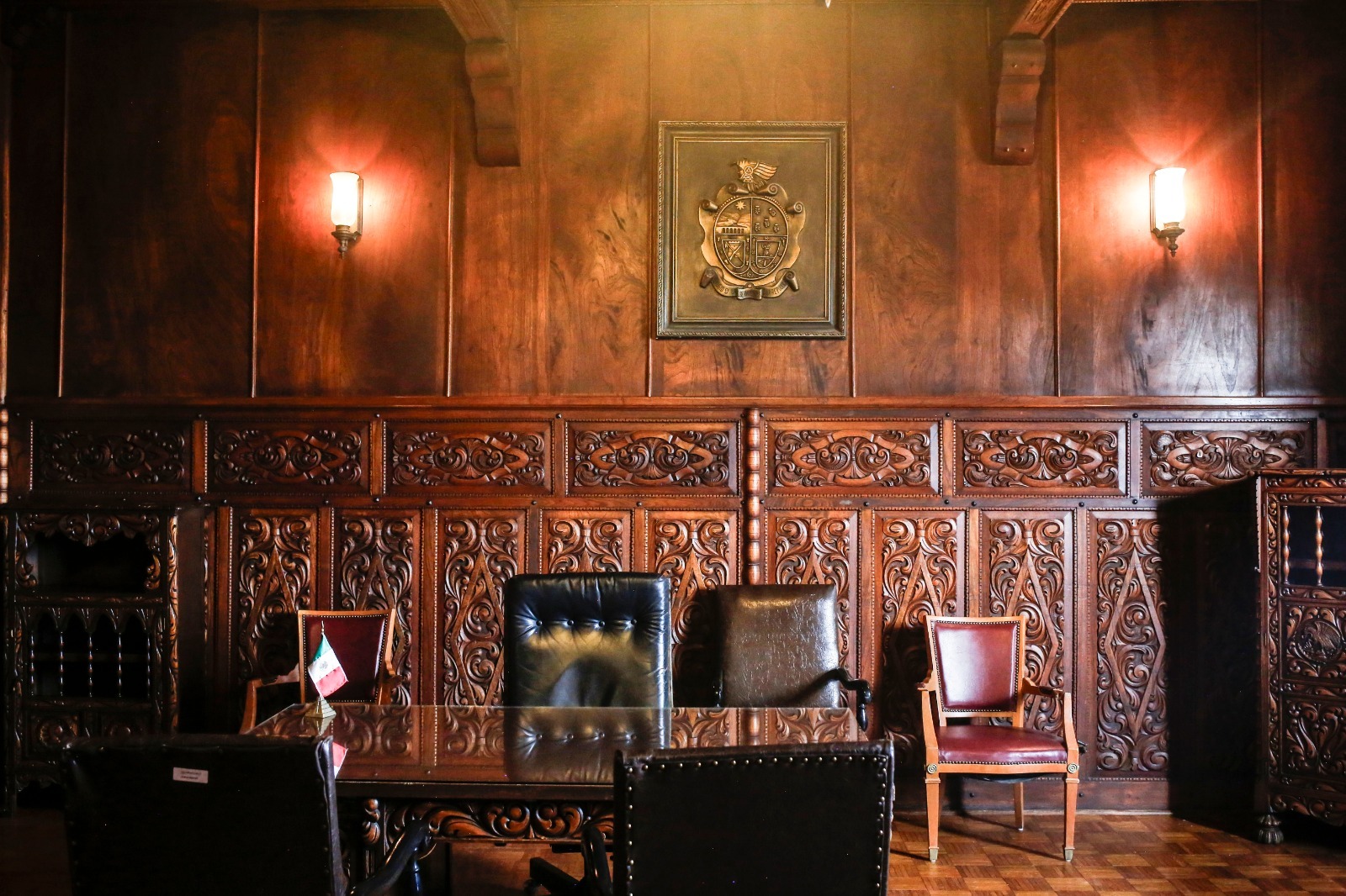 Por su parte, el despacho presidencial, adornado con madera roja, resguarda muebles originales de época, entre ellos el escritorio del presidente municipal y la silla presidencial, utilizada de manera continua entre 1942 y 1983, piezas emblemáticas del poder municipal juarense.