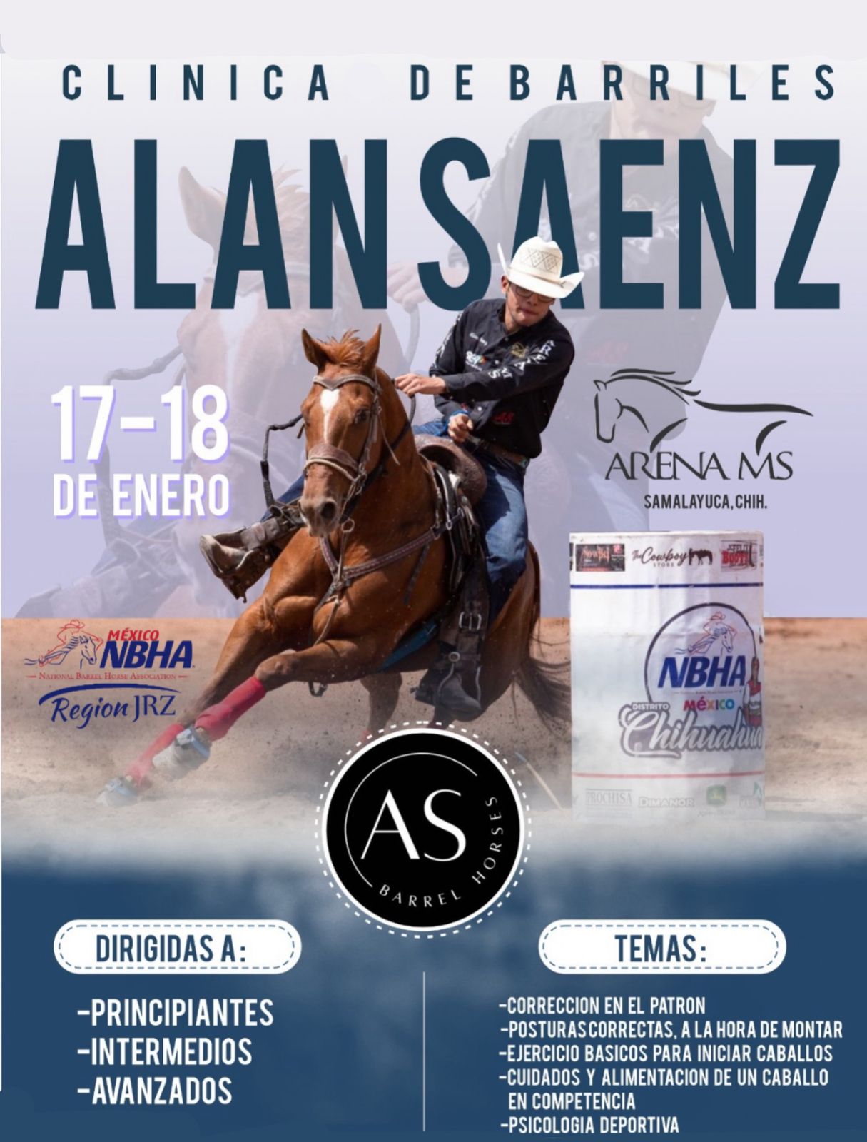 La Asociación Nacional de Caballos Barrileros Región Juárez (NBHA por sus siglas en inglés), organizará una clínica de barriles por parte de Alan Sáenz en la Arena MS, el próximo 17 y 18 de enero, la cual va dirigida a principiantes, intermedios y avanzados abarcando los temas de corrección en el patrón, posturas correctas a la hora de montar, ejercicios básicos para iniciar caballos, cuidados y alimentación de un caballo en competencia y psicología deportiva.