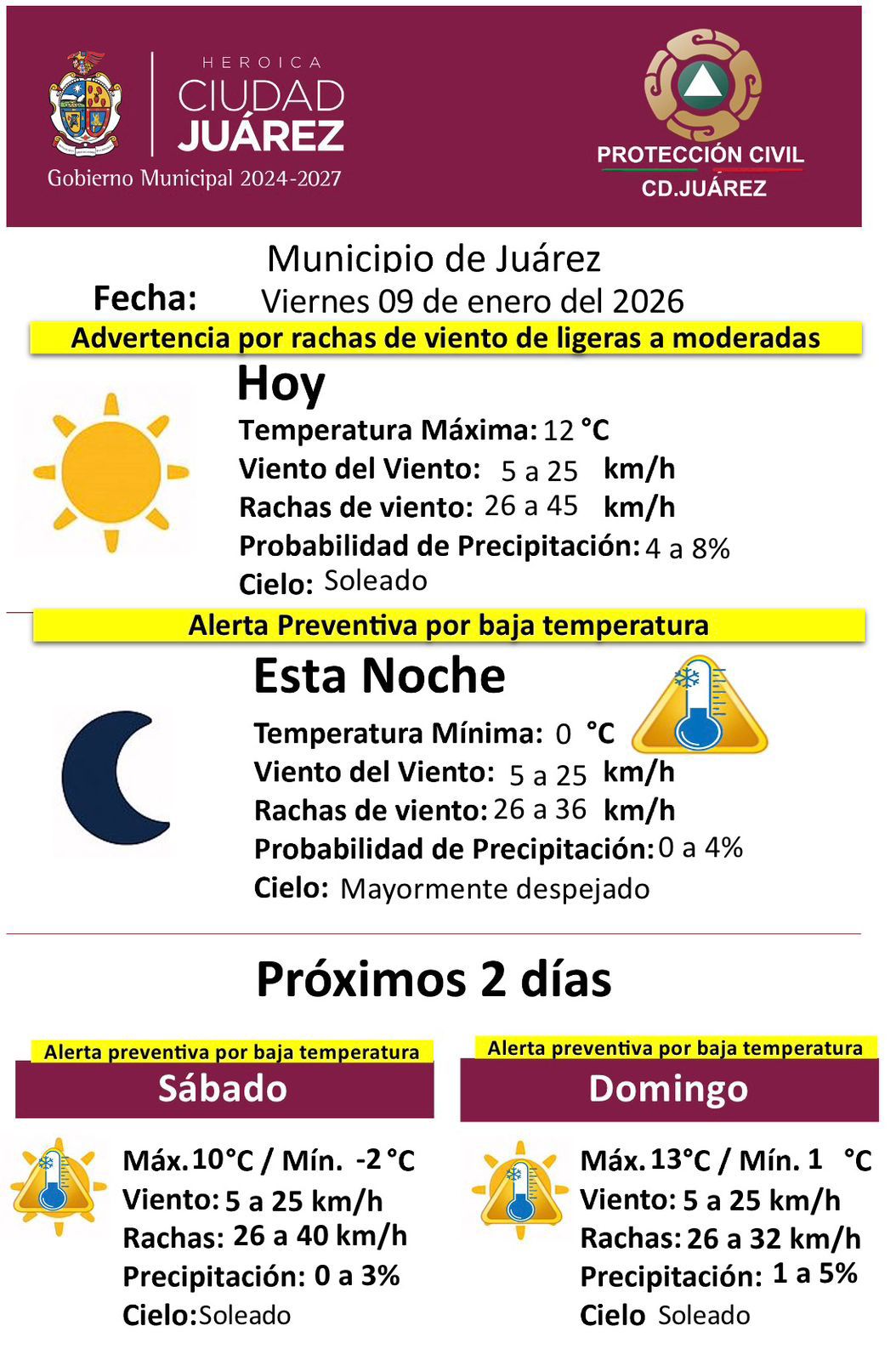 La Dirección General de Protección Civil del Municipio emitió un aviso preventivo para este viernes 9 de enero, ante la presencia de rachas de viento de ligeras a moderadas y el descenso de temperaturas en la ciudad.