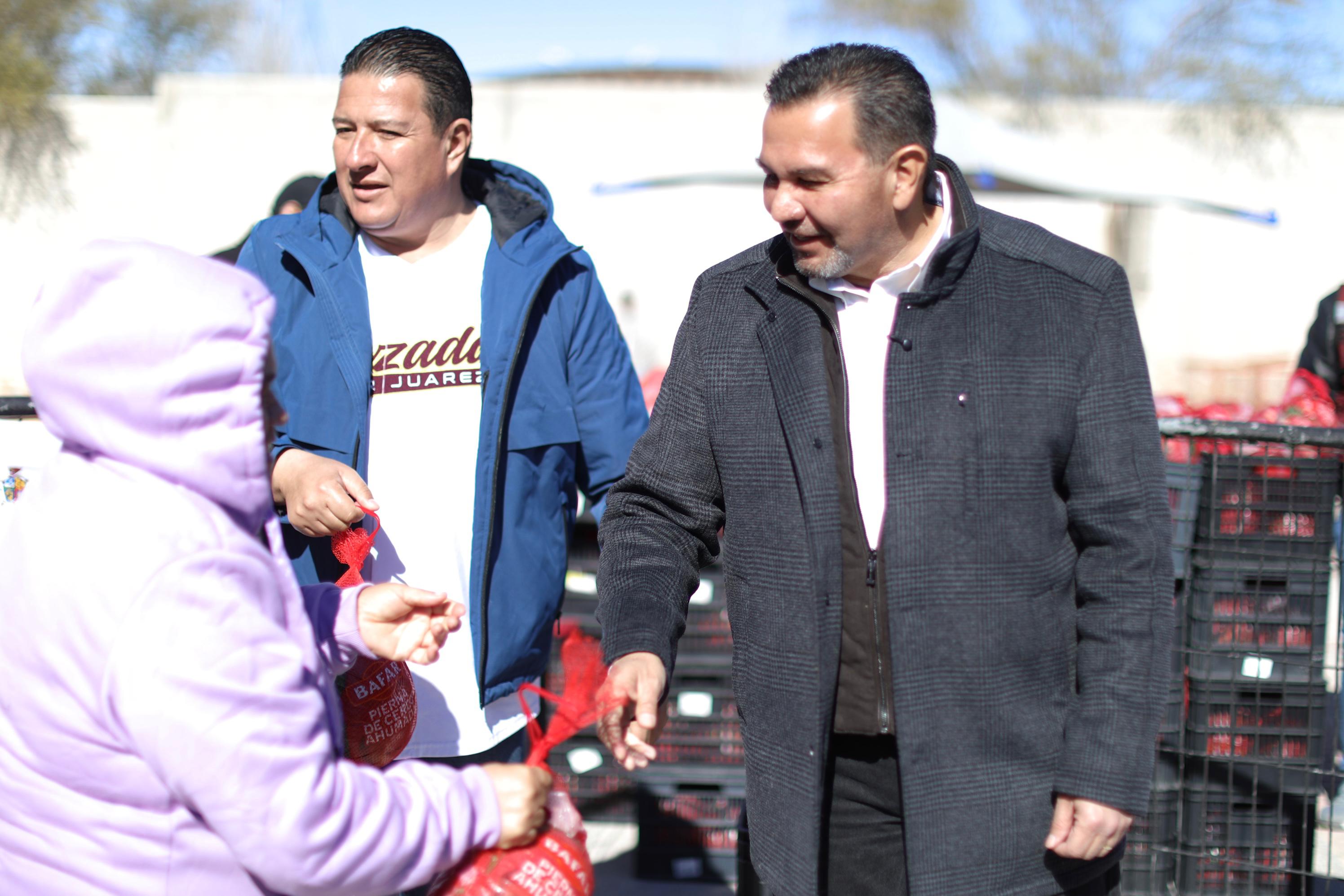 El Presidente Municipal, Cruz Pérez Cuéllar, convivió con vecinas y vecinos de la colonia Los Kilómetros en el Centro Comunitario José Refugio Sánchez, donde realizó la entrega de 350 piernas de cerdo como apoyo a la economía familiar en este inicio de año.