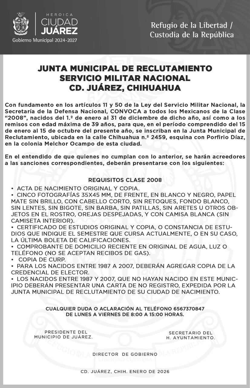 Todos los mexicanos de la clase 2007, que hayan nacido entre el 1 de enero al 31 de diciembre de dicho año y remisos, con edad máxima de 39 años, pueden acudir a la Junta Municipal de Reclutamiento para cumplir con el Servicio Militar Nacional y obtener de esta manera su cartilla.
