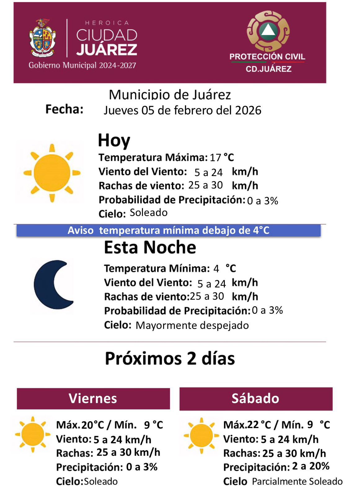 La Dirección General de Protección Civil del Municipio de Juárez dio a conocer el pronóstico del clima para este jueves 5 de febrero de 2026, en el que se prevén condiciones mayormente estables, con cielo despejado y temperaturas templadas durante el día, así como descenso térmico por la noche.