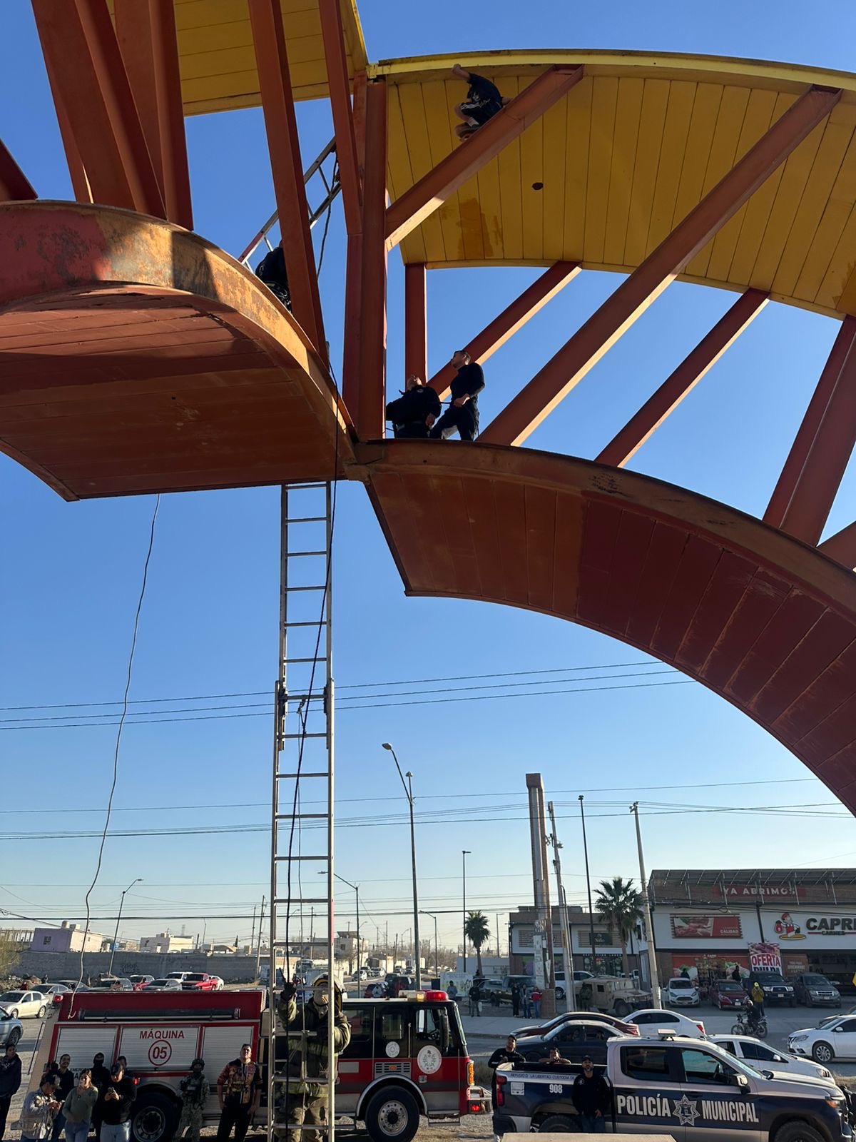 Al arribar al lugar, el personal especializado detectó que la persona se encontraba sobre estructuras metálicas a una altura aproximada de 20 metros, por lo que se activaron de inmediato los protocolos de rescate. Para llevar a cabo las maniobras fue necesario el uso de escaleras de 24 y 12 pies, así como una escalera telescópica perteneciente a la máquina 18.