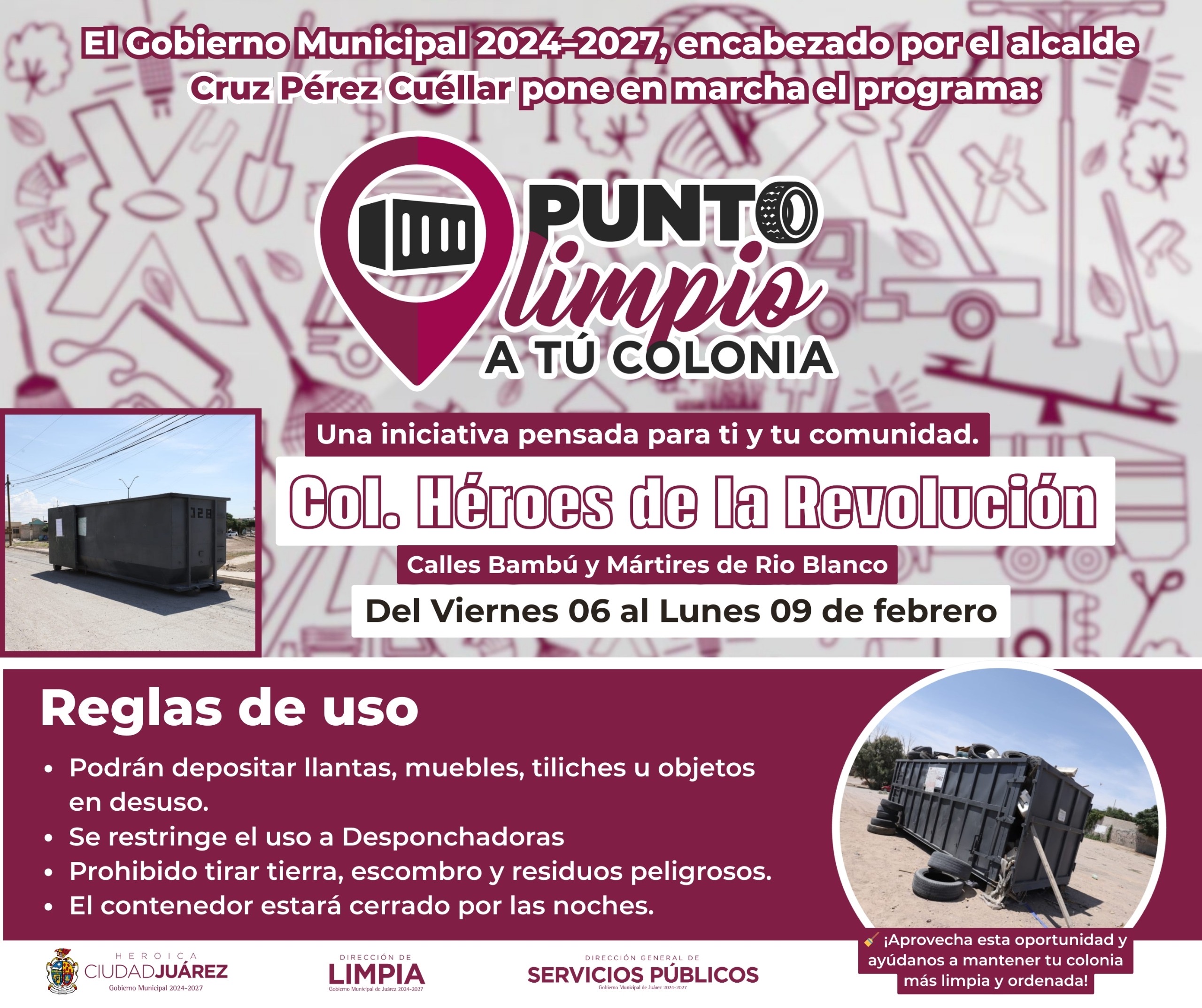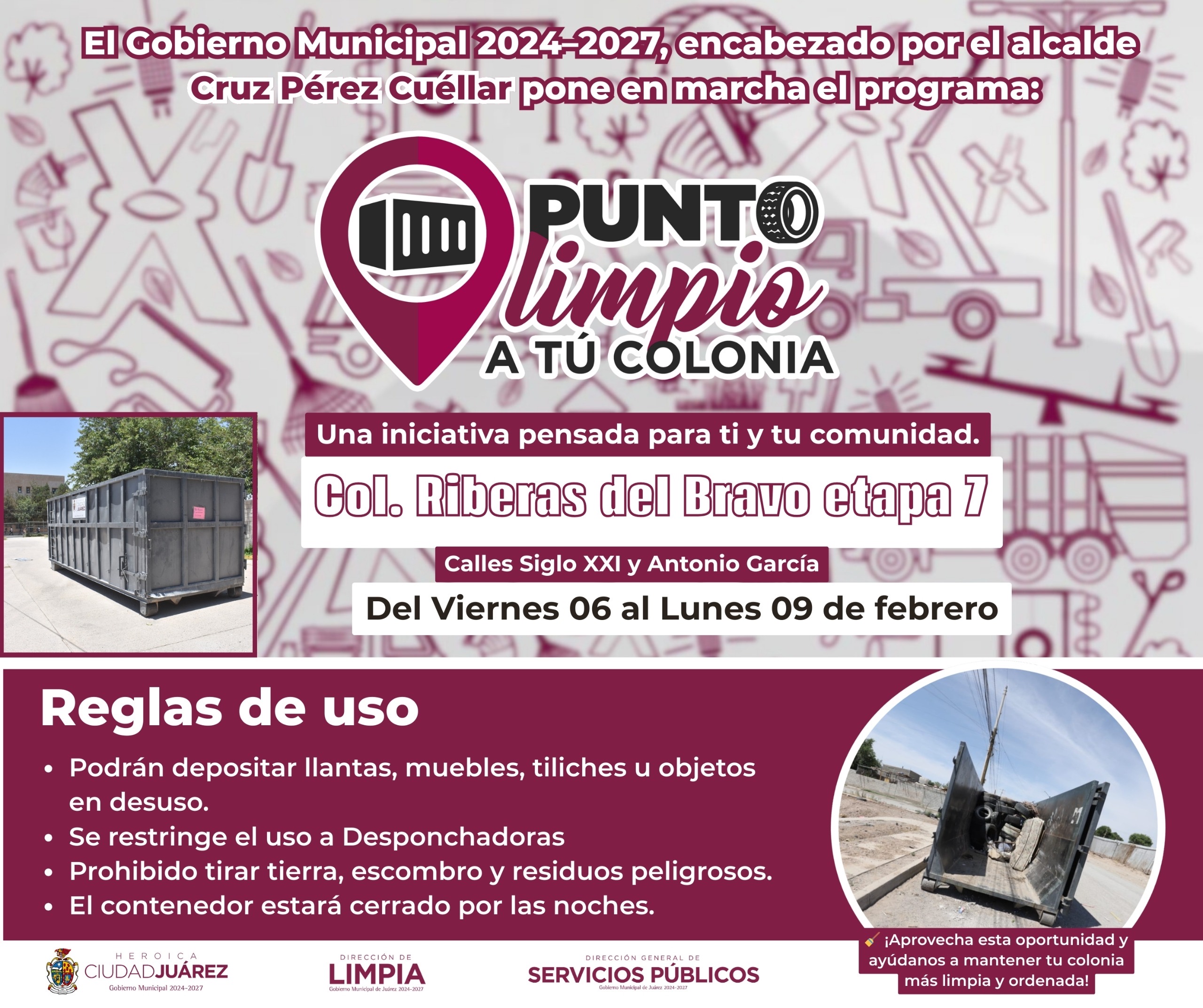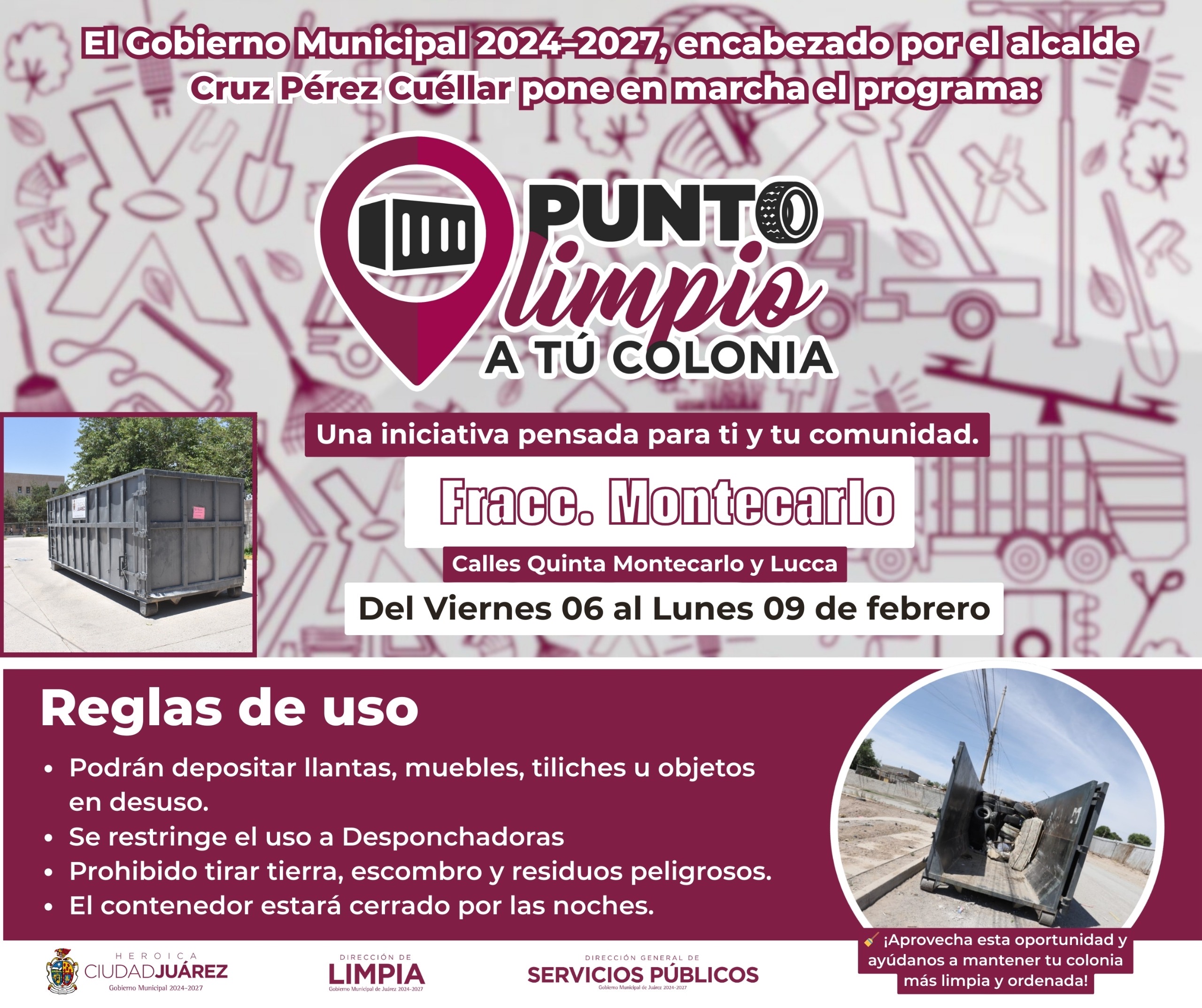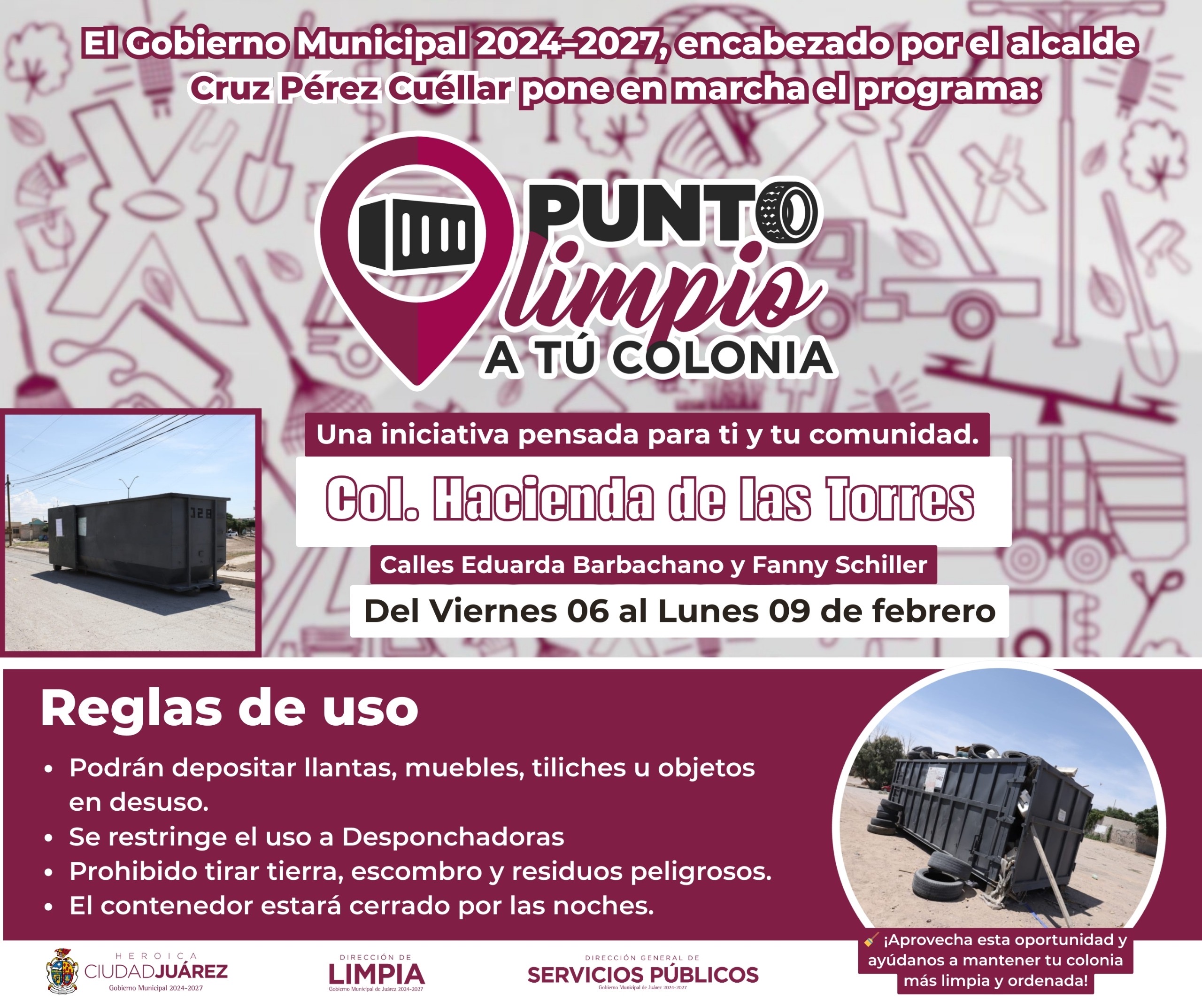 La Dirección General de Servicios Públicos Municipales, a través de la Dirección de Limpia, instaló desde el viernes 6 y hasta el lunes 9 de febrero, cuatro Puntos Limpios a tu Colonia.