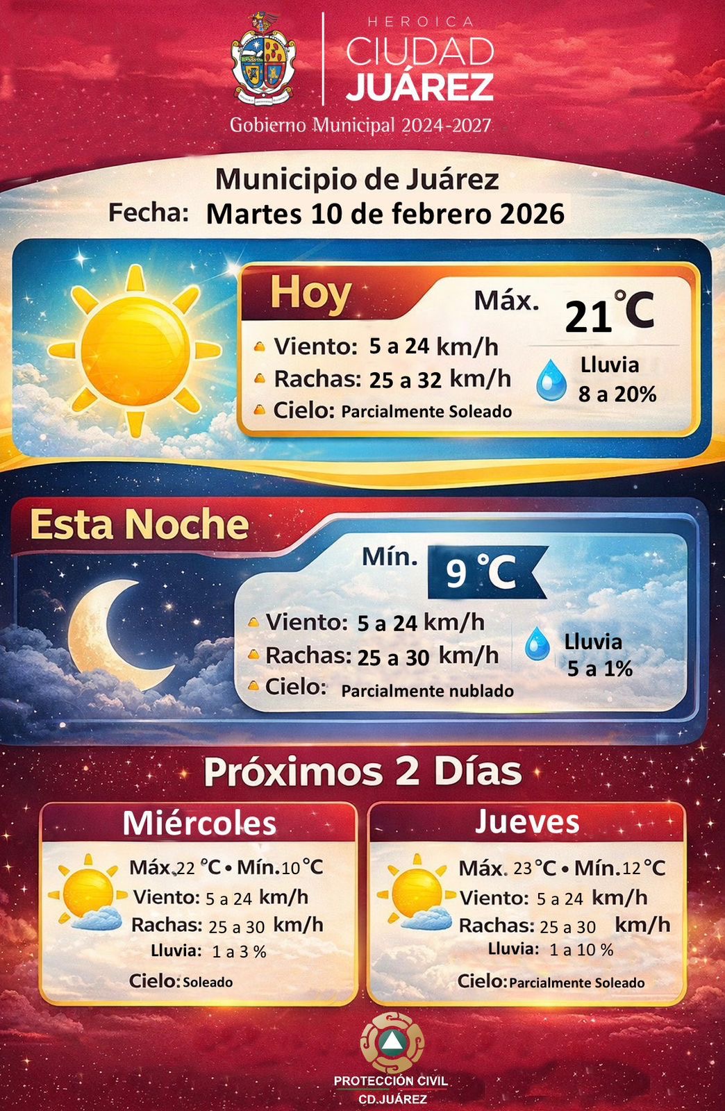 La Dirección General de Protección Civil informa el pronóstico del tiempo para este martes 10 de febrero de 2026 en el municipio de Ciudad Juárez, donde se esperan condiciones mayormente estables, con variaciones moderadas en temperatura y presencia de viento.