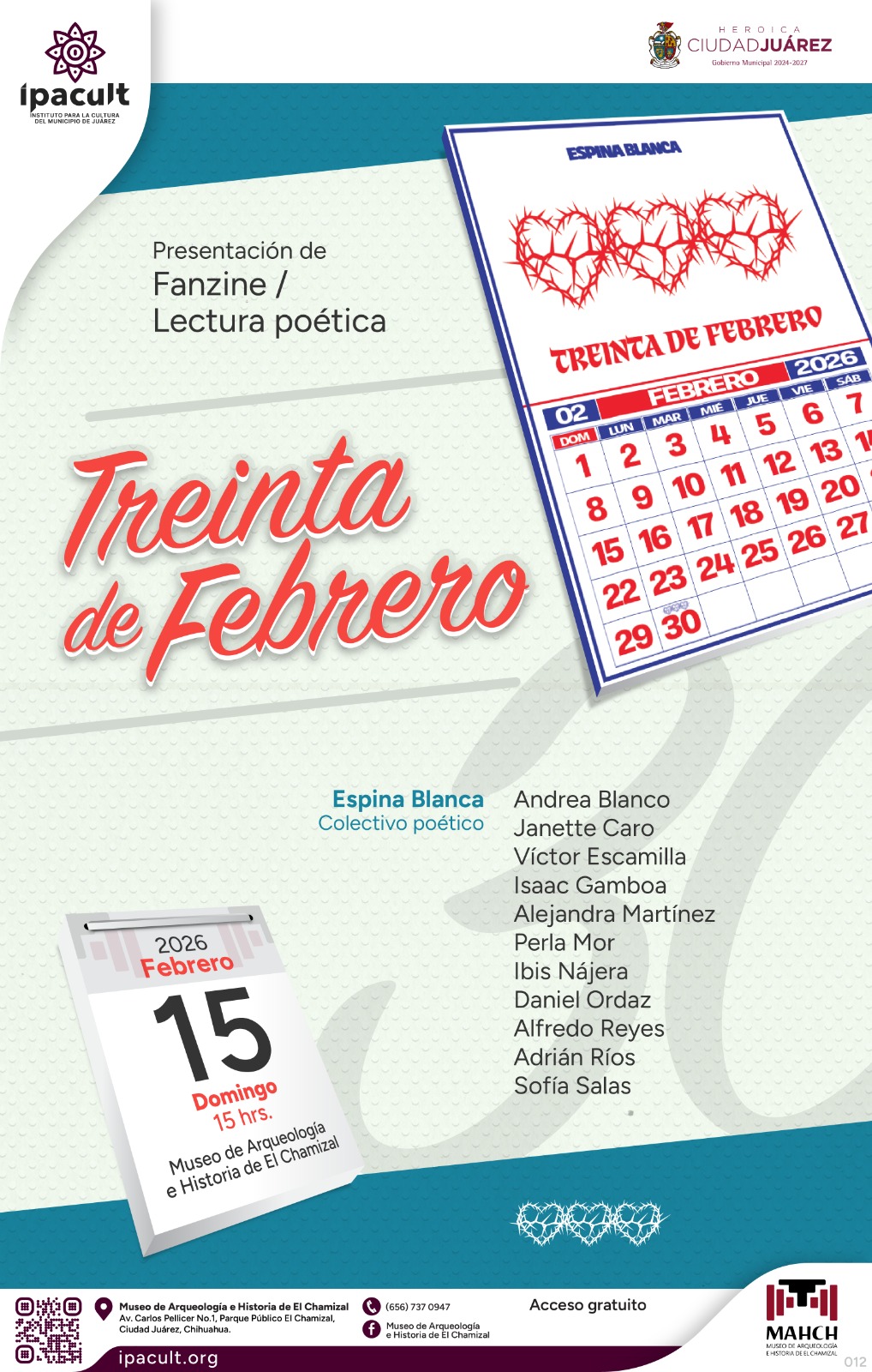 El Instituto para la Cultura del Municipio de Juárez (IPACULT) invita a la comunidad a la presentación del fanzine “30 de febrero”, primera edición del Colectivo Espina Blanca, Colectivo Poético, que se llevará a cabo el próximo domingo 15 de febrero a las 3:00 de la tarde en el Museo de Arqueología e Historia de El Chamizal.