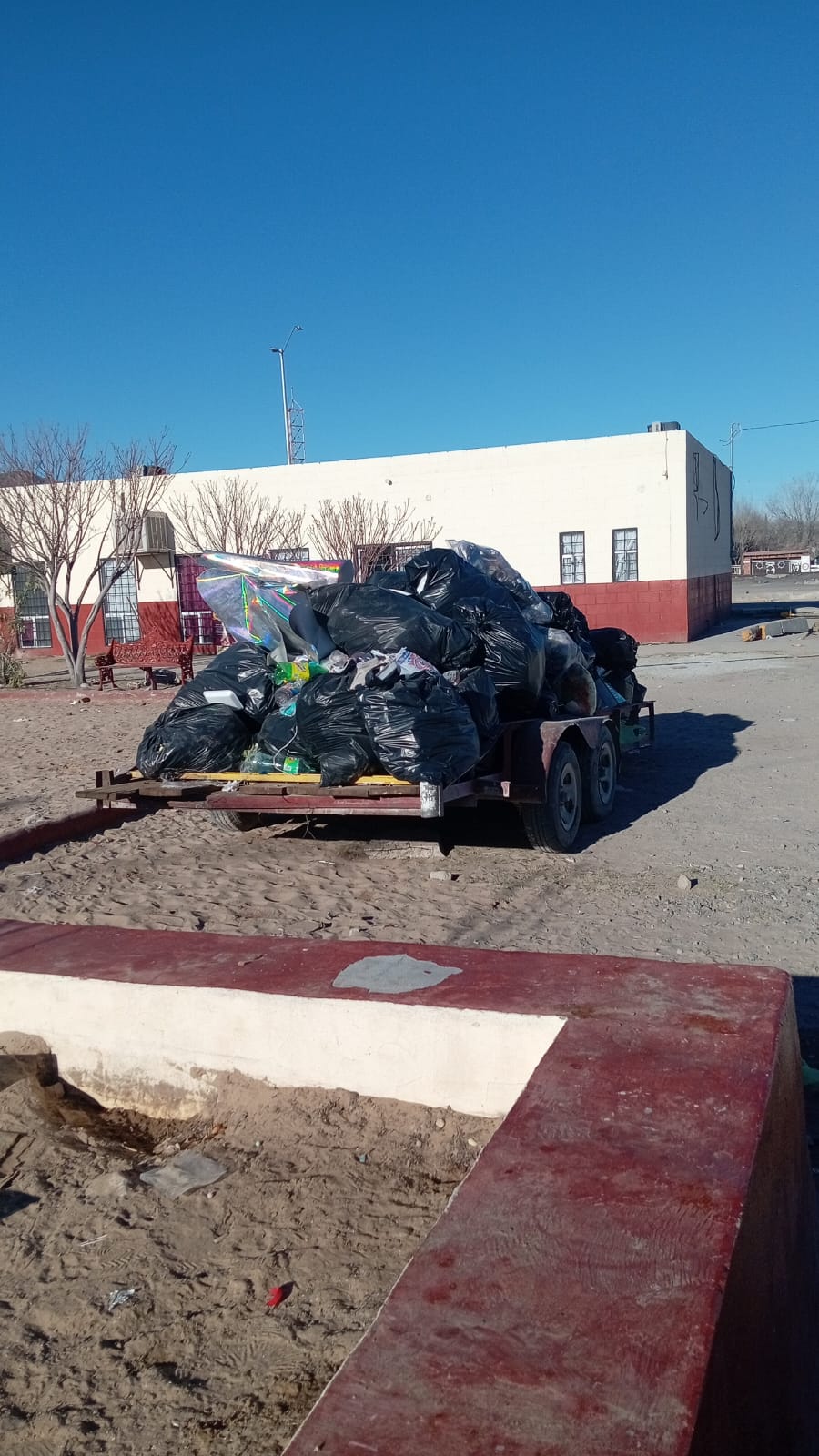 Las cuadrillas de la Dirección de Limpia llevan a cabo labores de limpieza en el ejido Samalayuca, luego de los festejos realizados en la comunidad el fin de semana, los cuales generaron acumulación de residuos.
