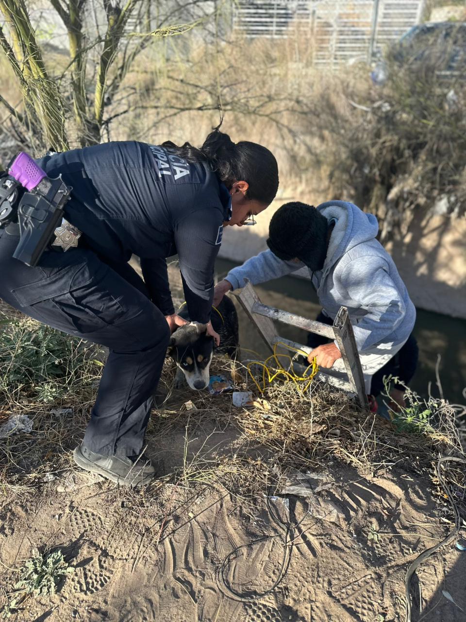 Elementos de la Secretaría de Seguridad Pública Municipal, adscritos a la Estación de Policía del Distrito Centro, brindaron apoyo en el rescate de un perro que se encontraba atrapado en un canal de aguas negras, en hechos registrados en la colonia Bellavista.