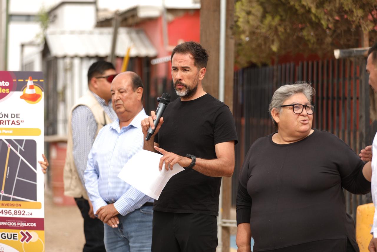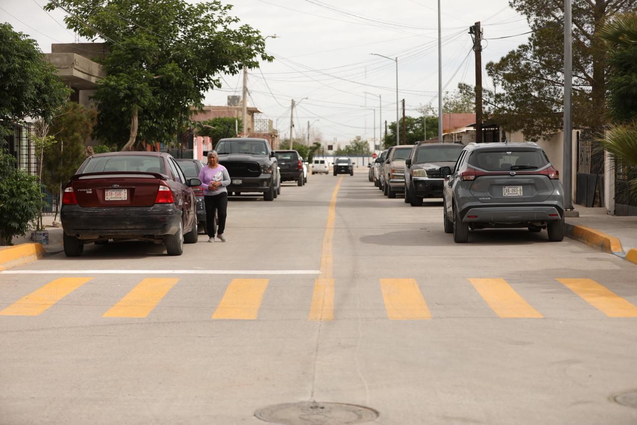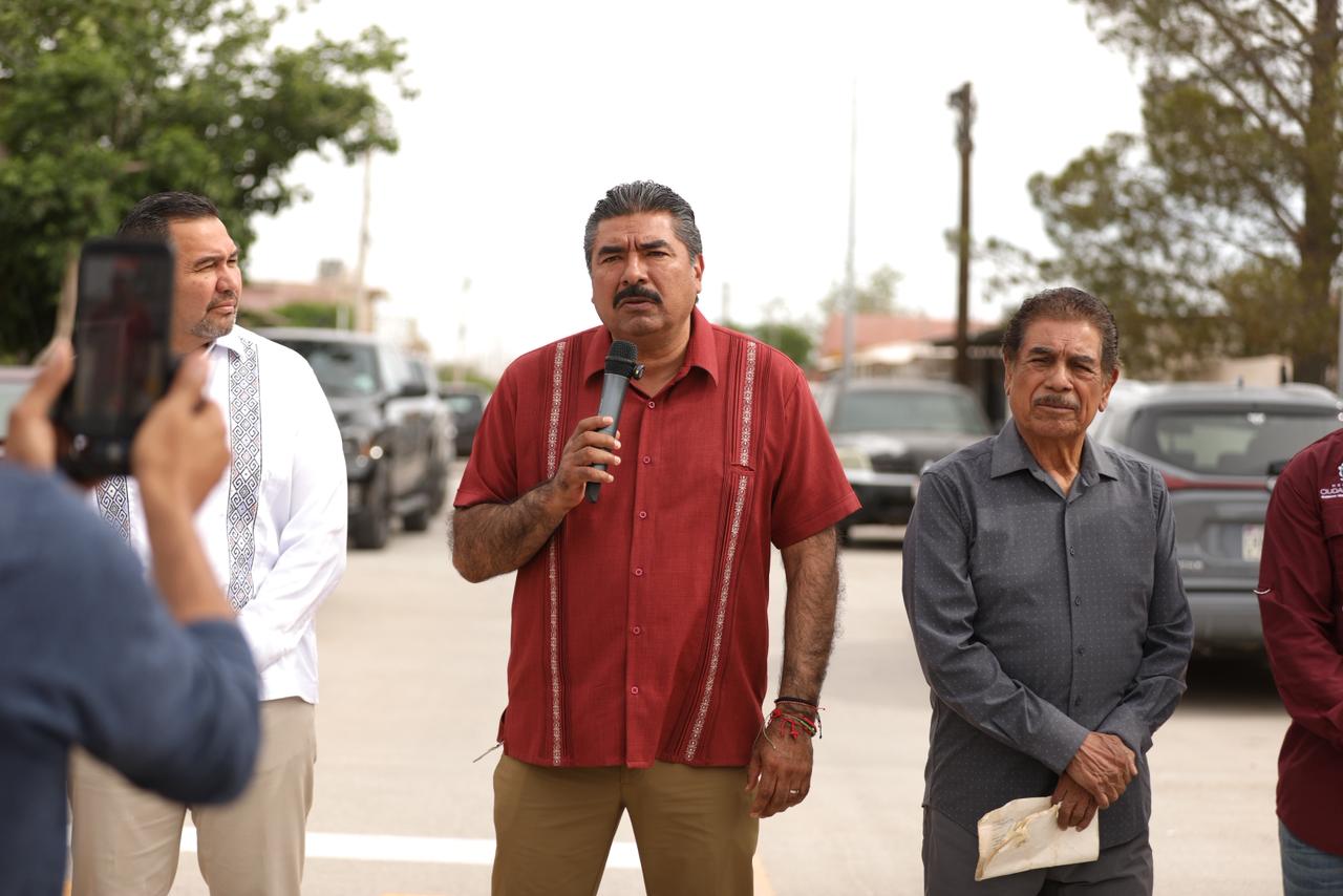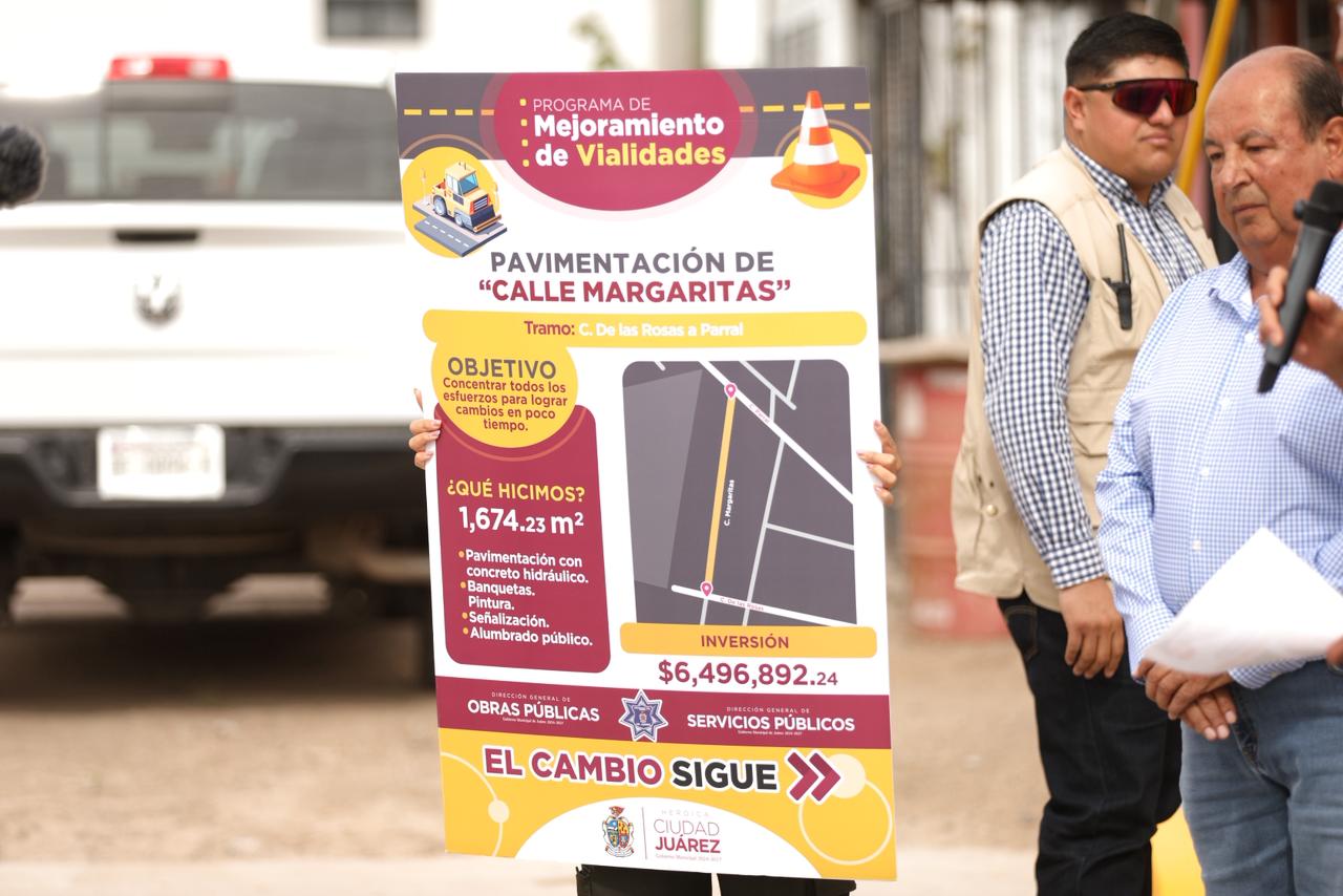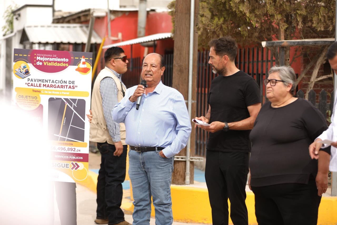 El Gobierno Municipal sigue con el Mejoramiento de Vialidades, ahora en la calle Margaritas, en el tramo de la calle De las Rosas a la calle Parral, obra que fue entregada este día por el Presidente Cruz Pérez Cuéllar.