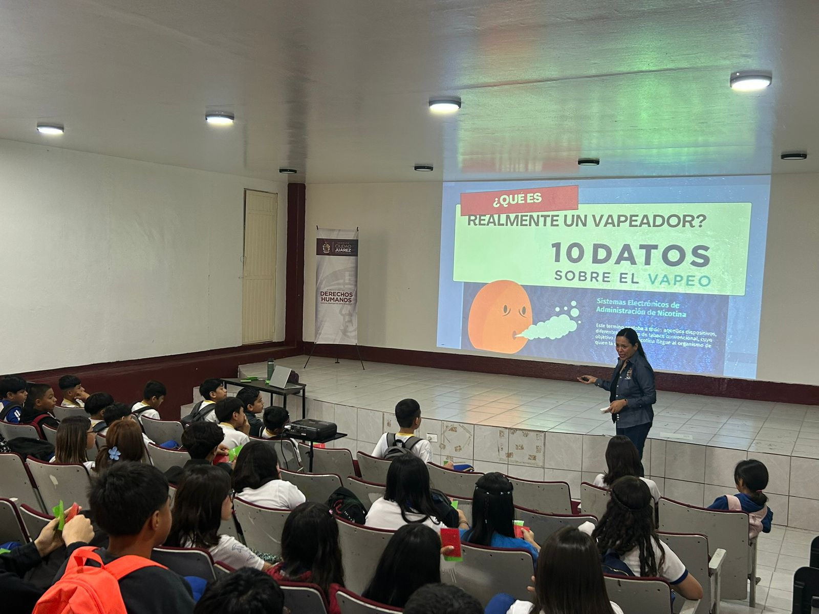 El área de capacitación de la Dirección de Derechos Humanos acudió a la Escuela Secundaria Federal número 4, con el objetivo de compartir con el alumnado de ambos turnos la plática “Riesgos del uso de vapeadores en la adolescencia”.