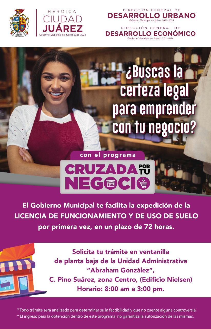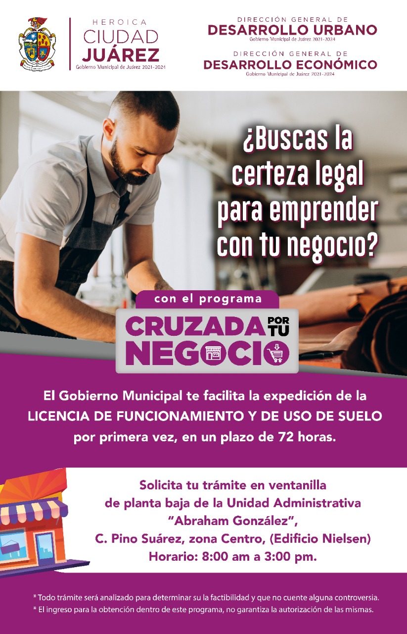 La Dirección General de Desarrollo Urbano extendió una invitación a la ciudadanÃa que busca emprender una actividad comercial, para que aprovechen los servicios del Programa Cruzada por tu Negocio, el cual facilita la emisión de las Licencias de Funcionamiento y de Uso de Suelo en un plazo de 72 horas.