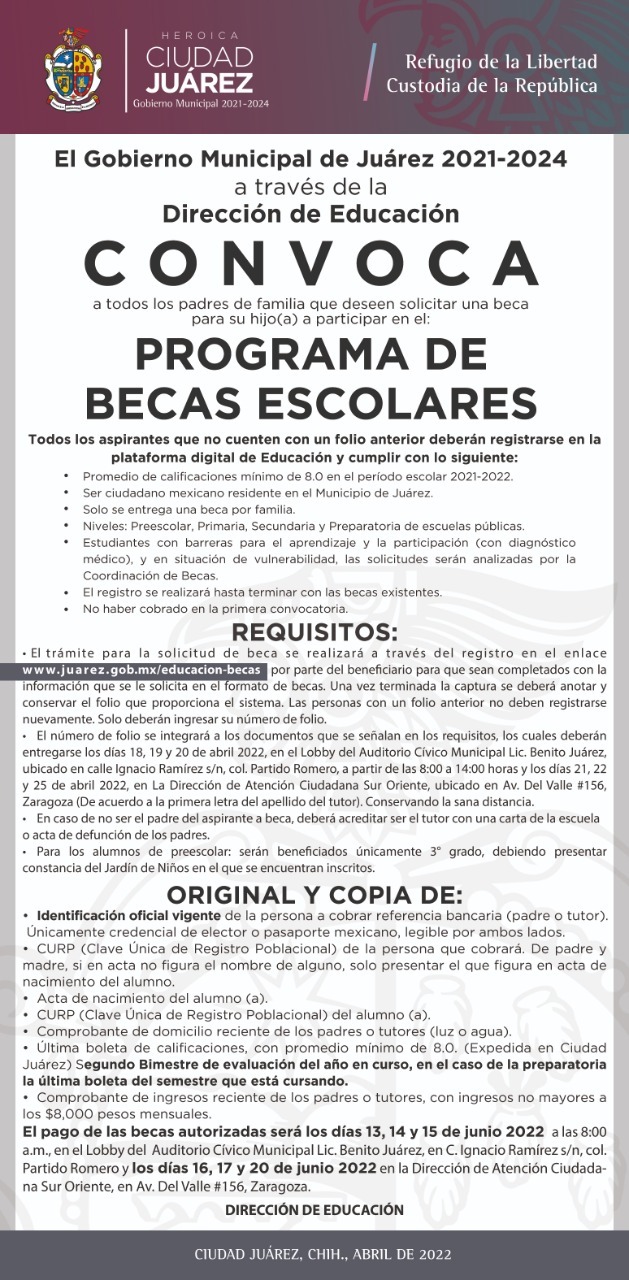Los requisitos son tener un promedio mínimo de 8.0 en el periodo escolar 2021-2022, ser ciudadano mexicano residente en el Municipio de Juárez, estudiar el nivel básico o media superior en escuelas públicas. En otros casos, se pide que los beneficiados sean estudiantes con barreras para el aprendizaje y la participación con diagnóstico médico, y en situación de vulnerabilidad.
