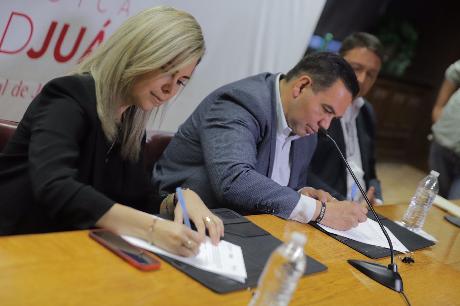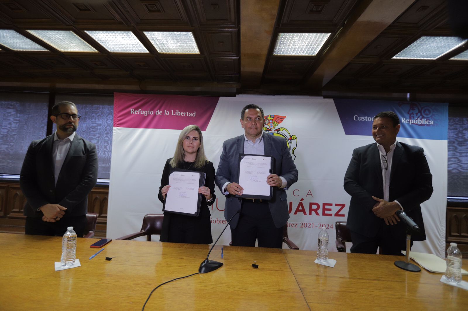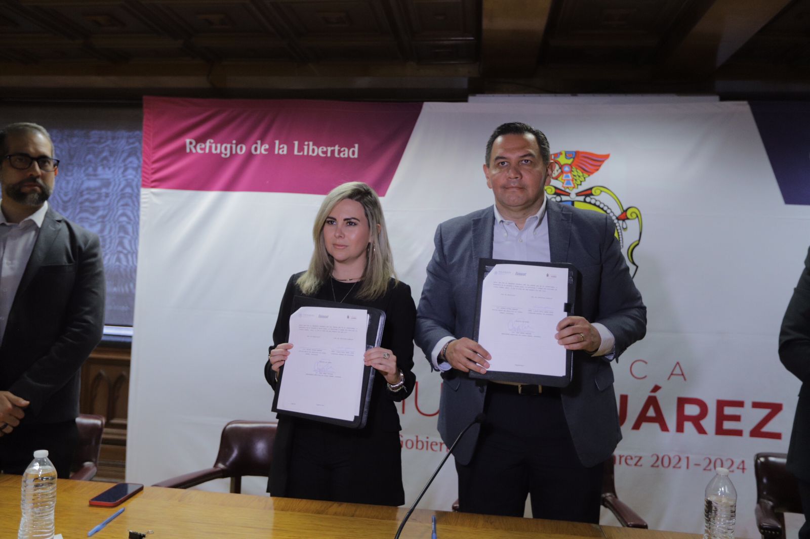 En la firma estuvieron Luis Villalobos, representante del Gobierno Municipal en Chihuahua y Valentín Luján Sandoval, coordinador administrativo de Fonacot en Ciudad Juárez..