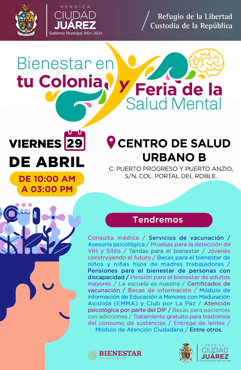 Este viernes 29 de abril la comunidad del suroriente de la ciudad podrá aprovechar los servicios que ofrecerán el Gobierno Municipal y Federal, a través del evento Bienestar en tu Colonia y Feria de la Salud Mental.