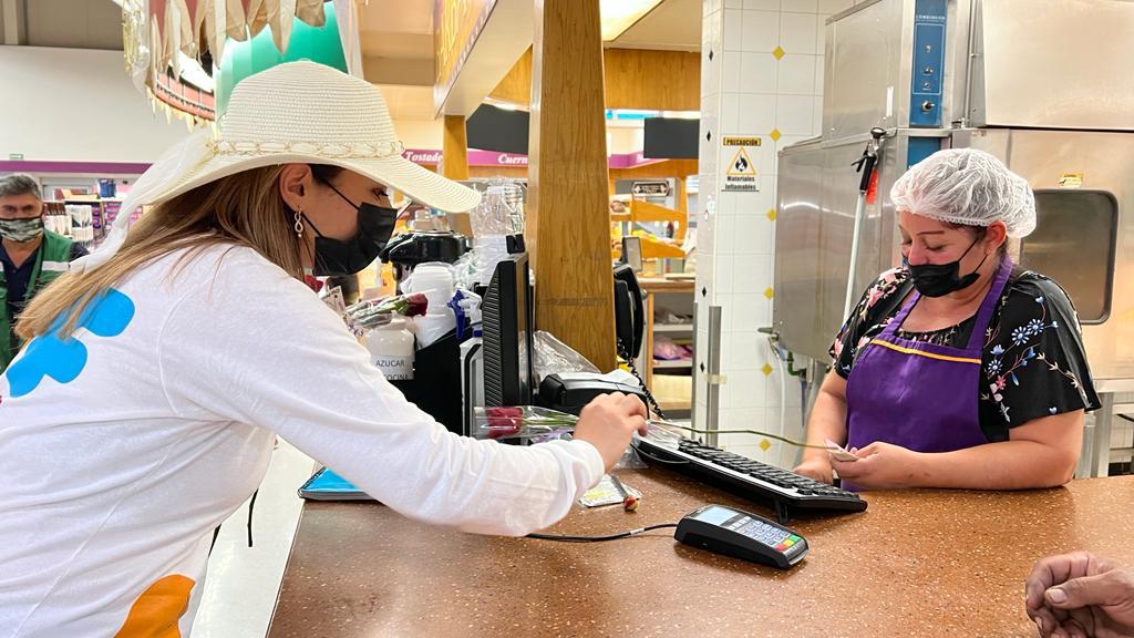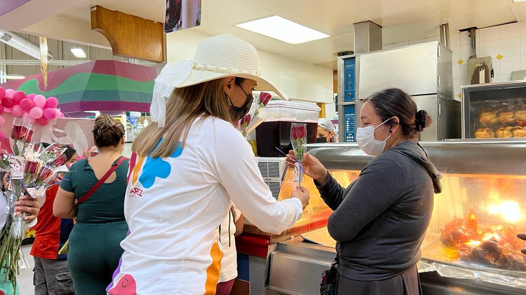 Mujeres que con una gran sonrisa recibieron el obsequio en tanto desarrollaban sus actividades cotidianas como empacadoras en tiendas de autoservicio o bien ofertando todo tipo de artÃculos de consumo.