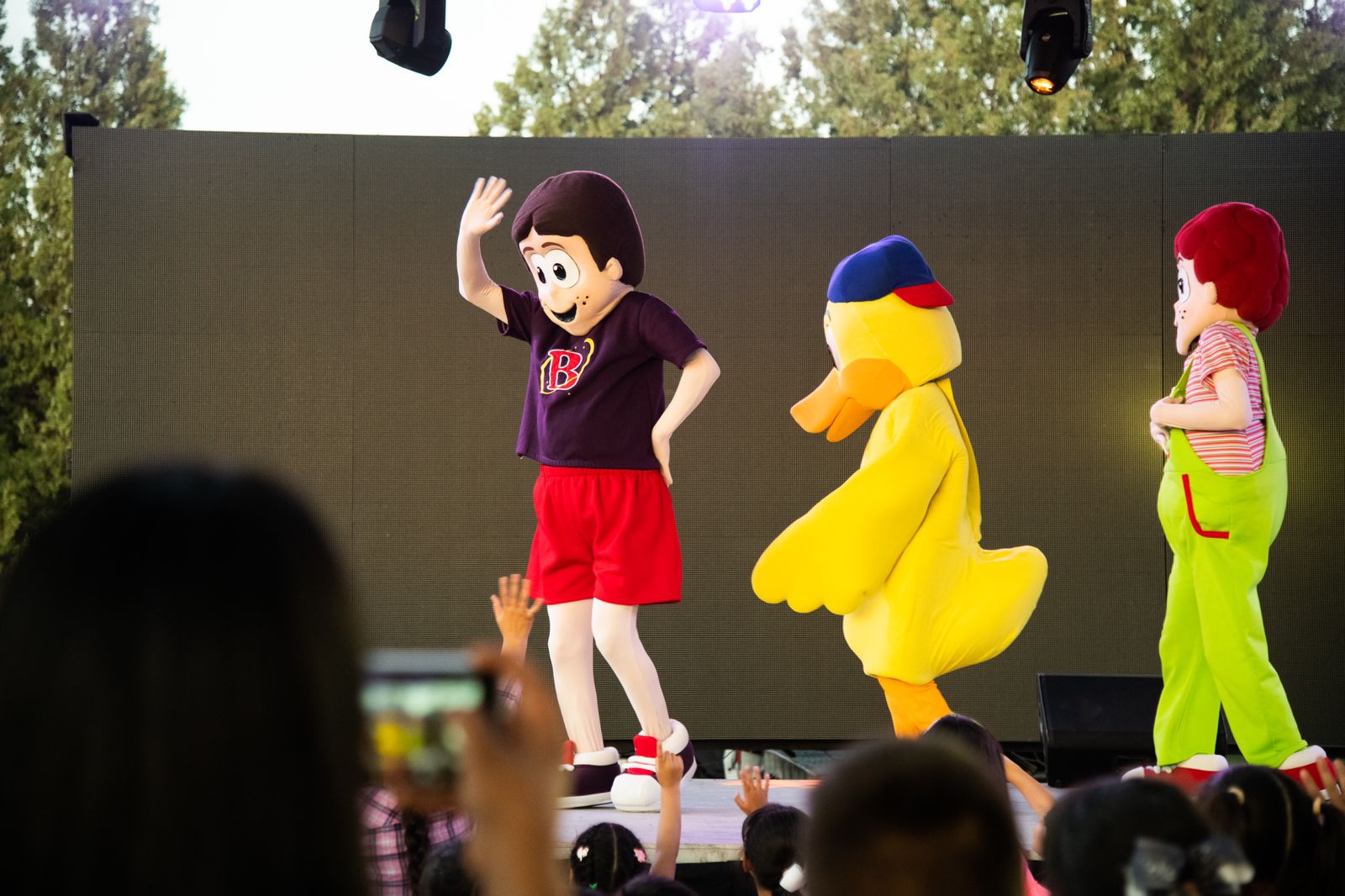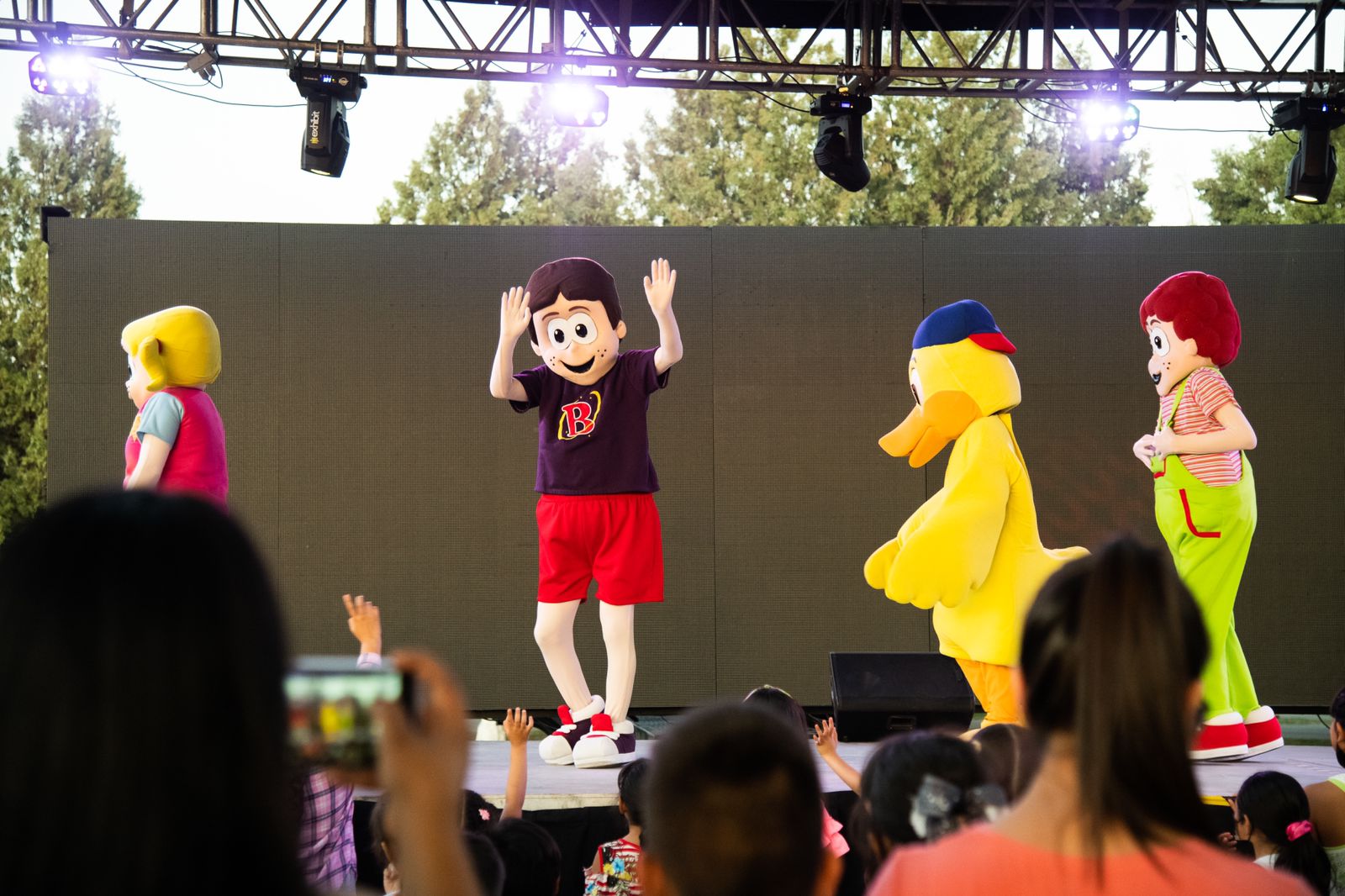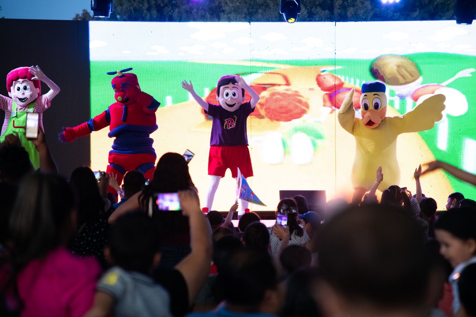 El concierto fue interactivo para todos, bailando, cantando, haciendo coros. Cinco botargas en escena y una espectacular pantalla con dibujos animados complementó la muestra musical.