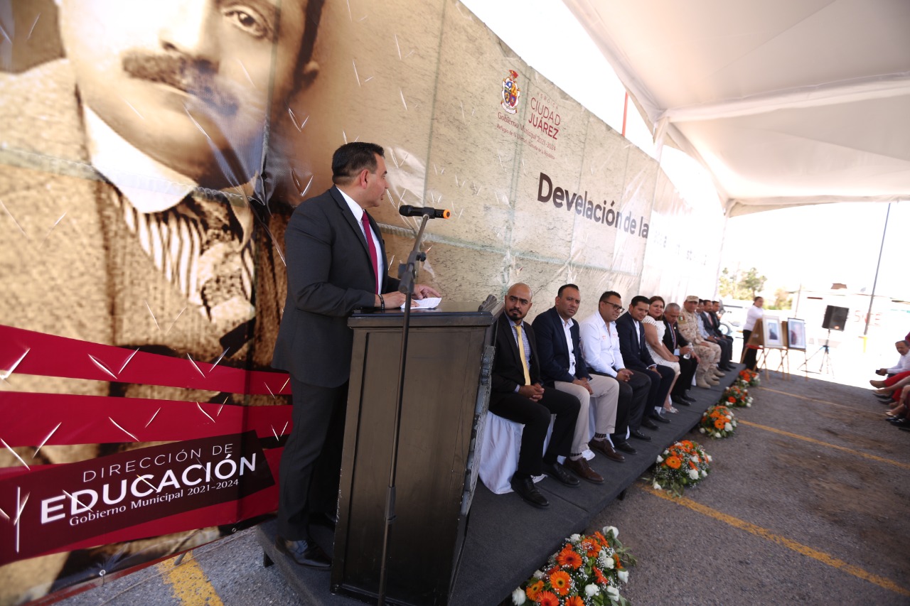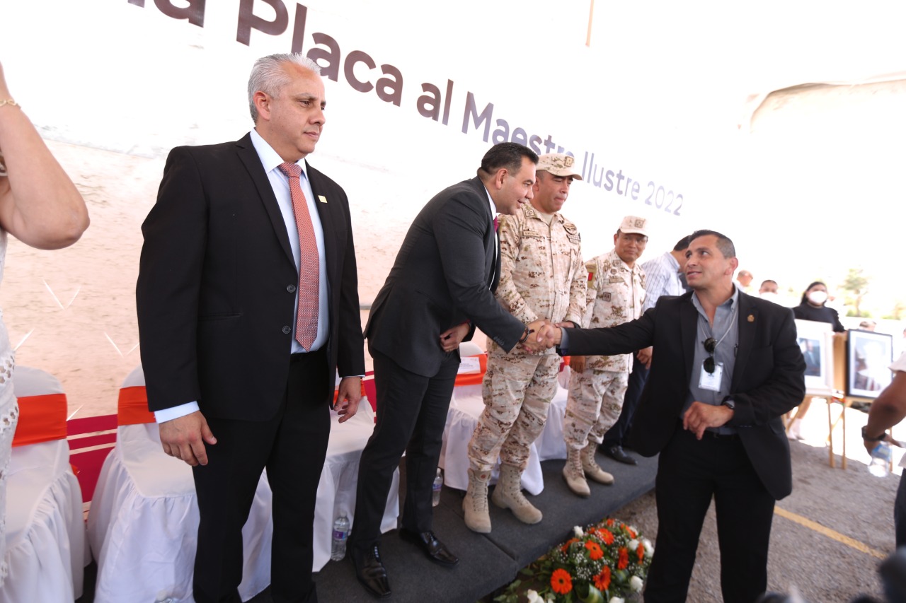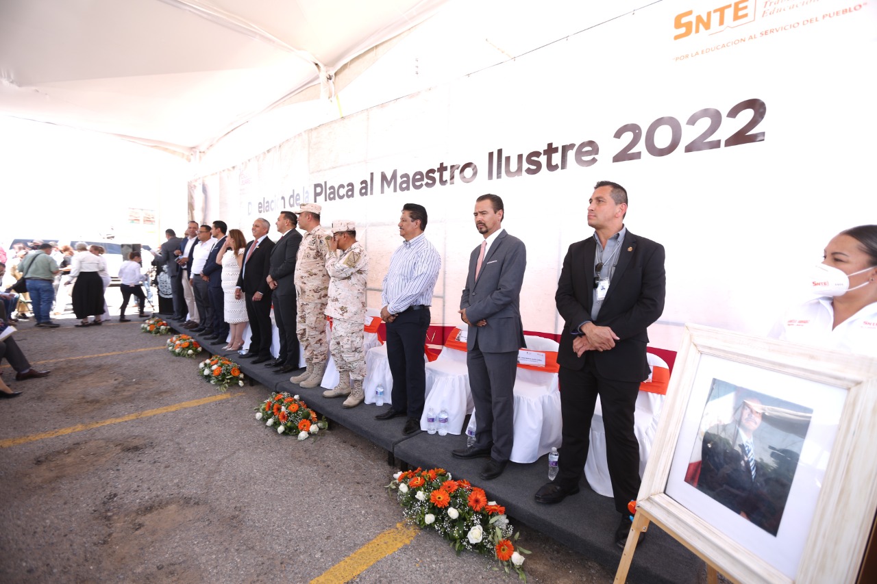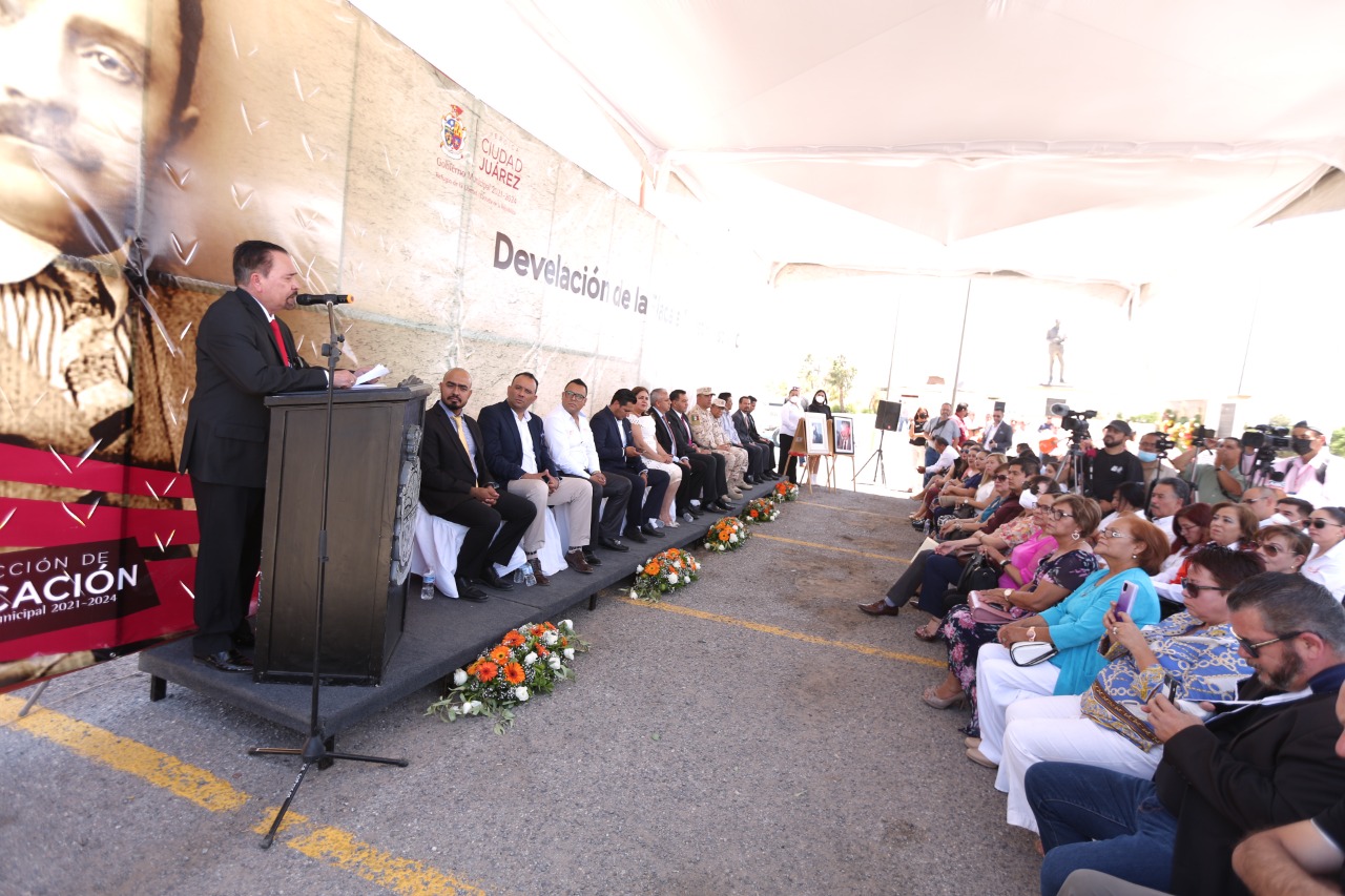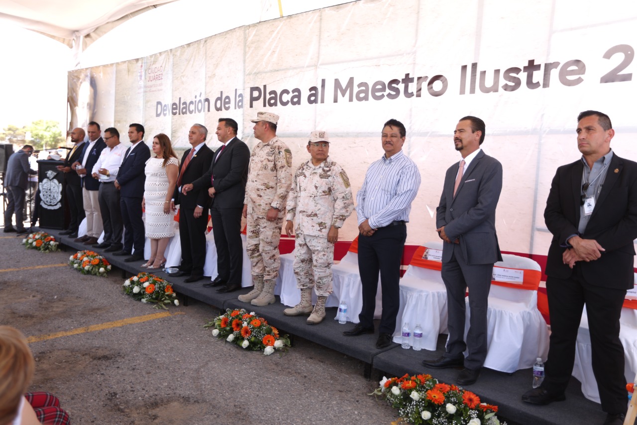 En el marco de la ceremonia de develación de la Placa al Maestro Ilustre 2022, el Presidente Municipal, Cruz Pérez Cuéllar, reiteró el compromiso de este Gobierno con la educación pública, laica y gratuita, a fin de apoyar a los niños juarenses que estudian en distintas escuelas de Juárez.