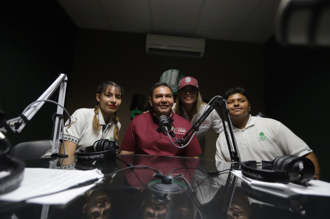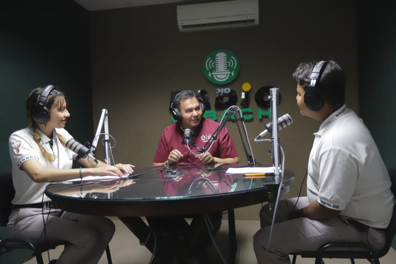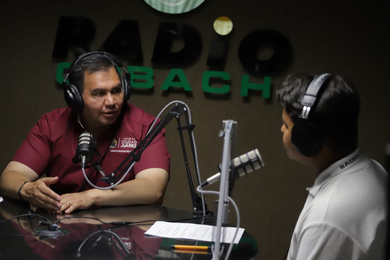Al finalizar el alcalde acudió hasta la cabina de Radio COBACH, donde fue entrevistado por Brayan Macías y Dalay Castanón, ambos estudiantes del Colegio de Bachilleres, quienes aprovecharon la oportunidad para preguntarle sobre sus años de juventud y los proyectos para esta ciudad, particularmente los que están enfocados en los jóvenes.