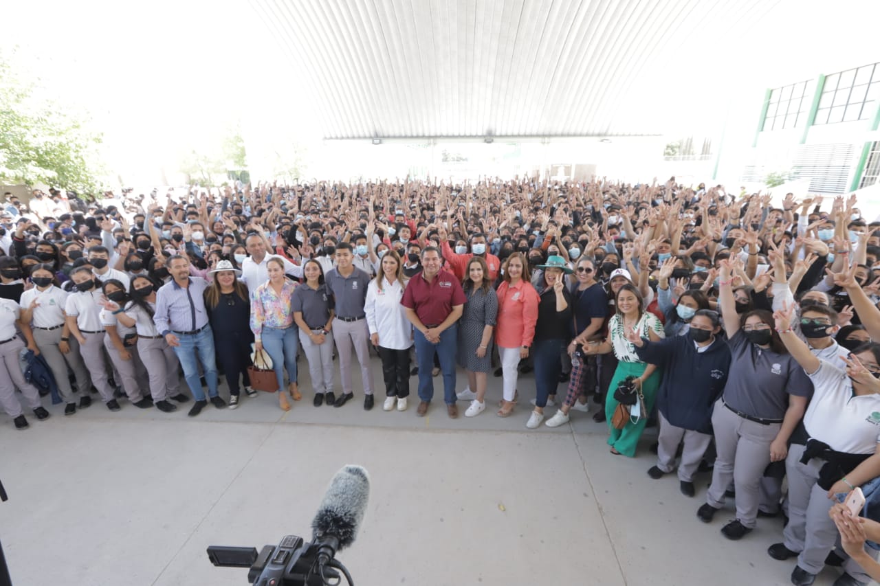 Más de dos mil estudiantes de ambos turnos se reunieron en la escuela para escuchar al alcalde, quien acudió acompañado de su esposa y Presidenta del DIF Municipal, Rubí Enríquez, así como regidores y directores del Ayuntamiento.