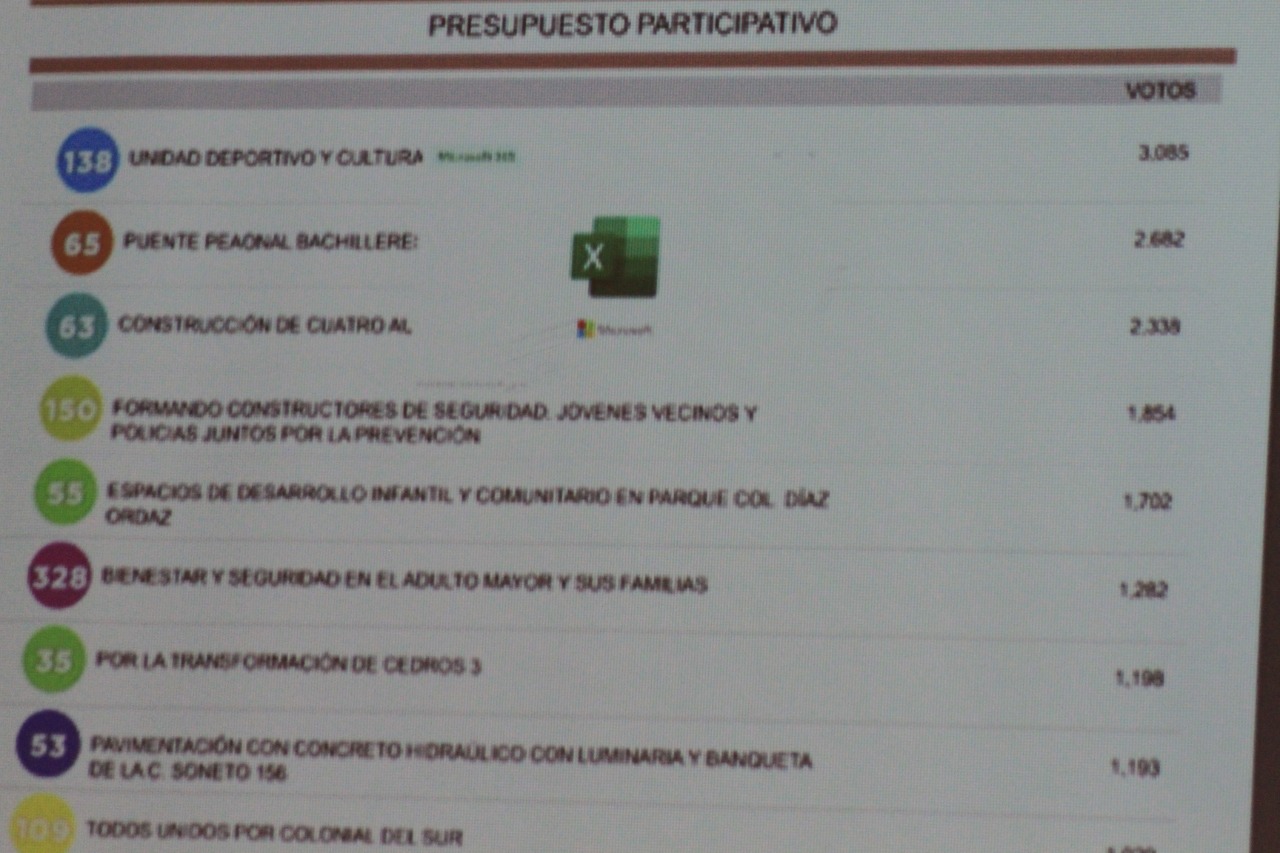 El director del Instututo Municipal de Investigación y Planeación, Roberto Mora Palacios, dio a conocer los proyectos que mayor porcentaje de votos obtuvieron, entre ellos el número 138 que corresponde a la Unidad deportiva y cultural del colegio de Bachilleres plantel 9, con 3 mil 085 votos; el proyecto 65 del Puente peatonal sobre Bachilleres 6, con 2 mil 682 votos; el número 63 que corresponde a la Construcción de cuatro aulas de cultura y arte, con 2 mil 338 votos; el número 150 denominado Formando constructores de seguridad, jóvenes vecinos y policías juntos por la prevención, con mil 854 votos.