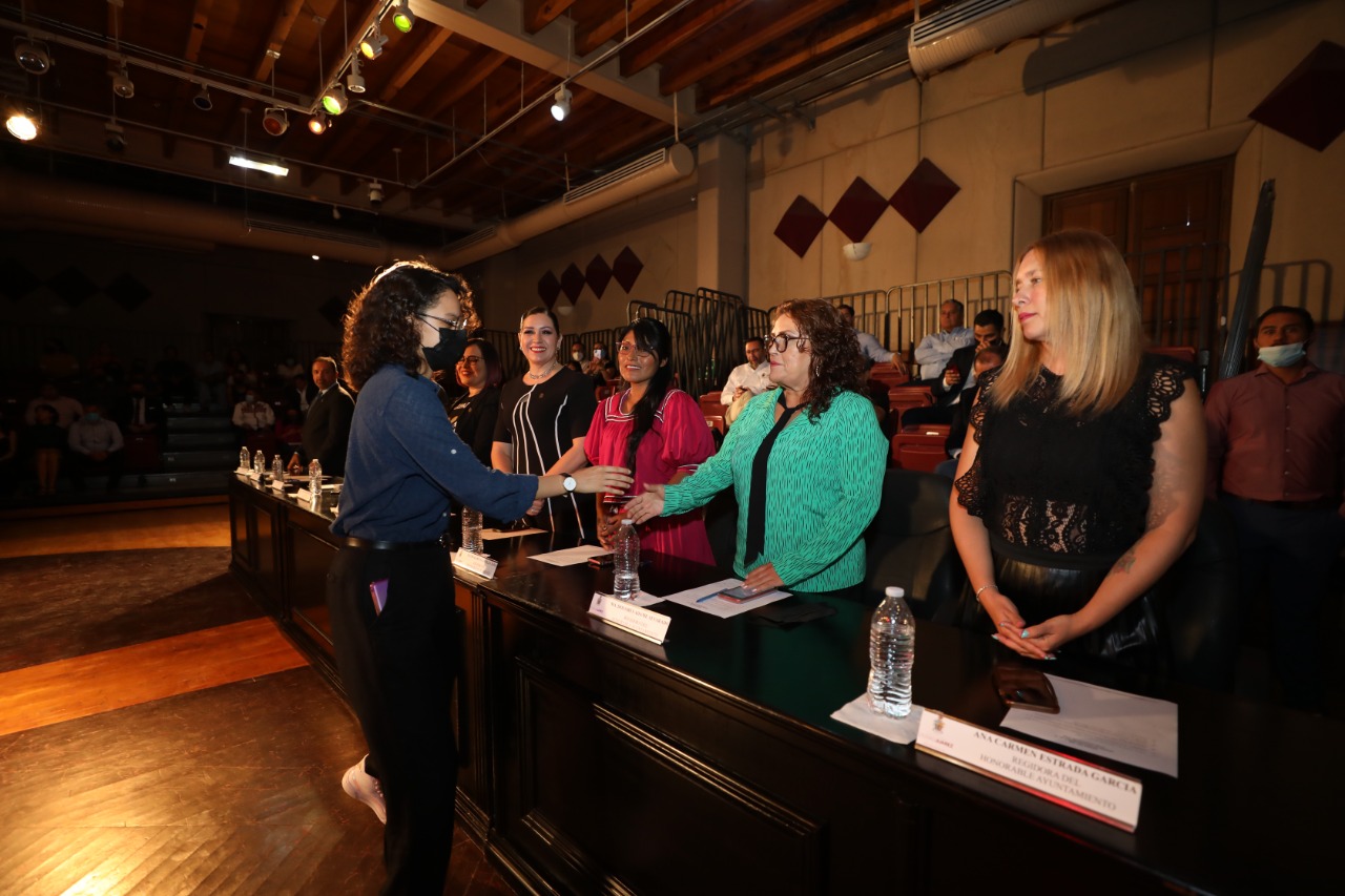 La premiación se llevó a cabo durante la sesión extraordinaria del Ayuntamiento, efectuada en el Centro Municipal de las Artes (CMA) de la antigua Presidencia Municipal, dónde el acto se inició con un minuto de silencio en memoria de las y los juarenses que perdieron la vida el jueves pasado víctimas de la violencia.