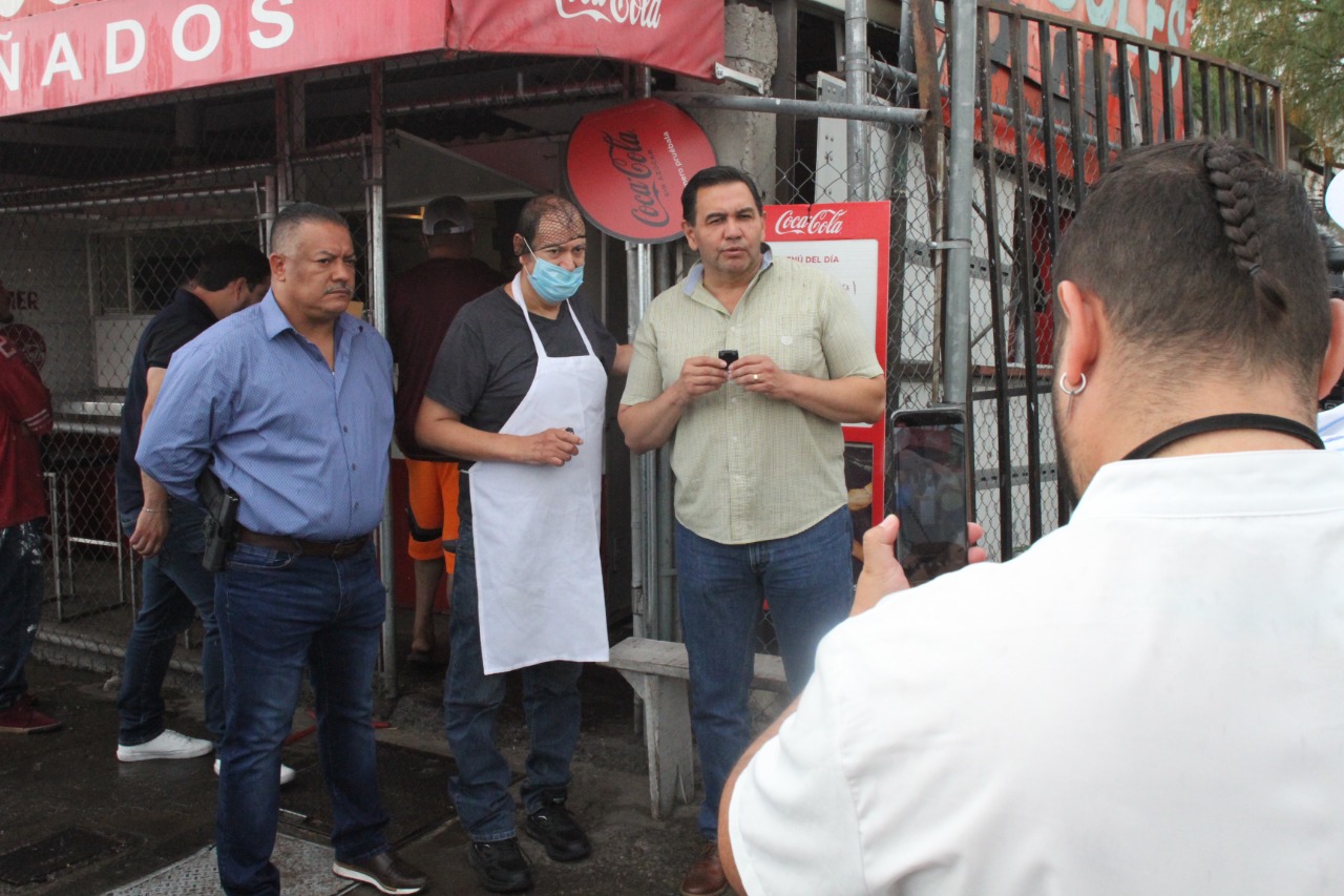Acompañado por el secretario de Seguridad Pública Municipal, César Omar Muñoz Morales, y otros miembros de la administración, el alcalde platicó con el propietario del negocio, Manuel Nayares, originario de Yepachi, Chihuahua, quien llegó a esta frontera en los años 70s en busca de mejor economía.