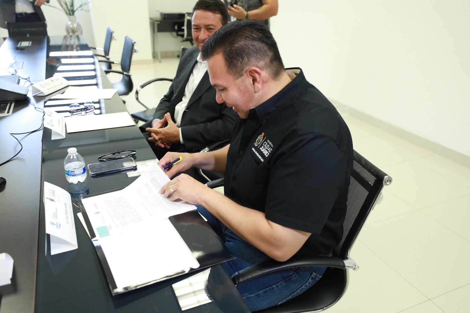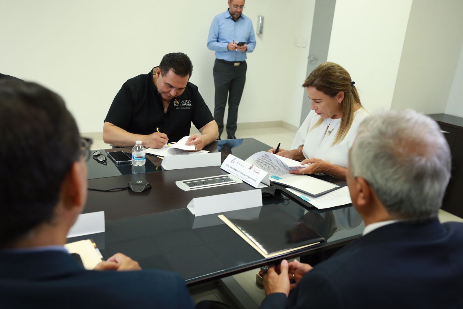 Además del Presidente Cruz Pérez Cuéllar y María Angélica Granados Trespalacios, en la firma del acuerdo estuvieron Arturo Acosta Fernández, director de Economía Social estatal; Fernando Alba Quiñonez, titular de la Subsecretaria de Minería, Industria y Energía estatal y Luis Villalobos Máynez, representante del Ayuntamiento de Juárez ante el Gobierno del Estado.
