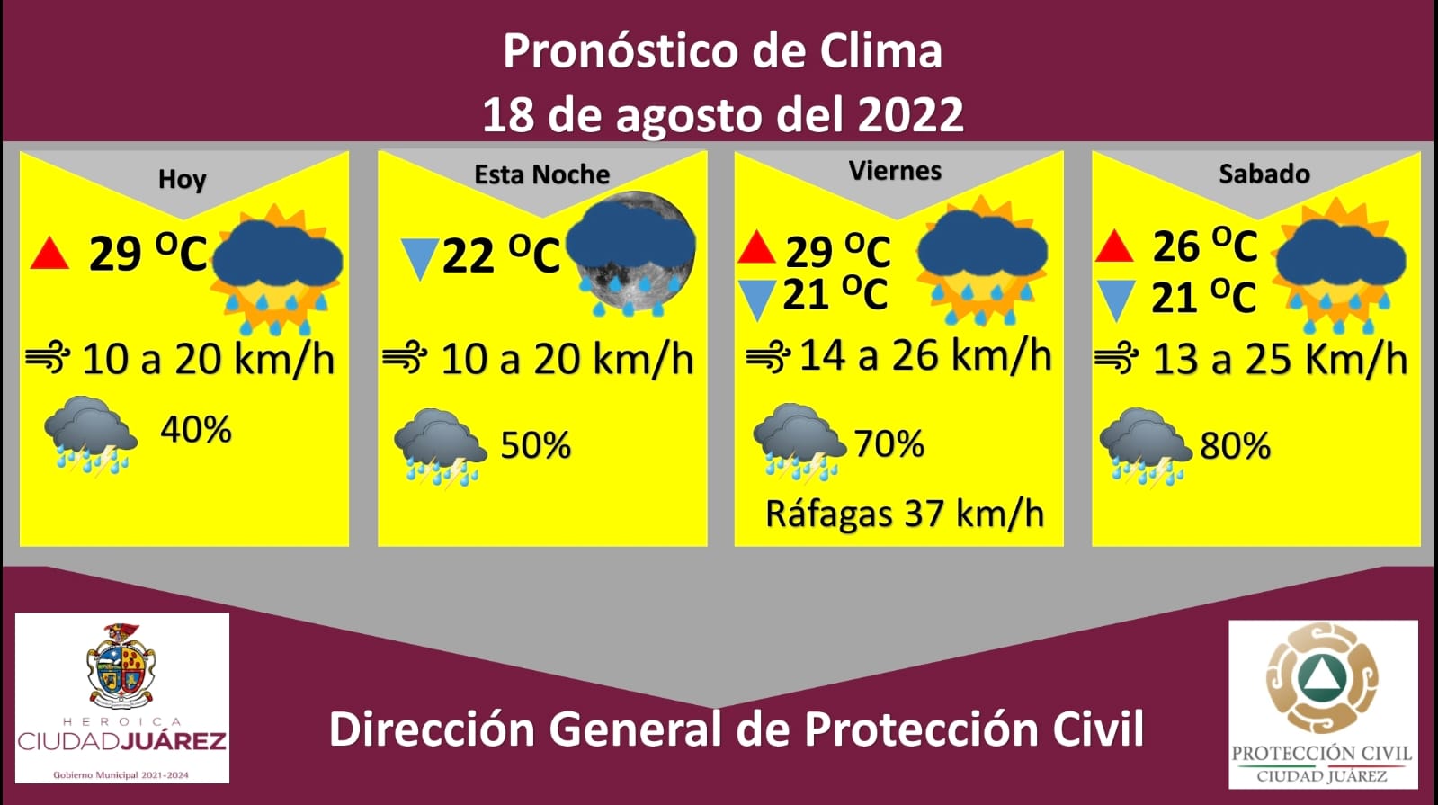 Con base en informes del Servicio Meteorológico Nacional, la Dirección General de Protección Civil emite una alerta amarilla para este jueves debido a que existe un 50 por ciento de probabilidad de lluvia y tormentas eléctricas aisladas, las cuales pueden causar inundaciones.