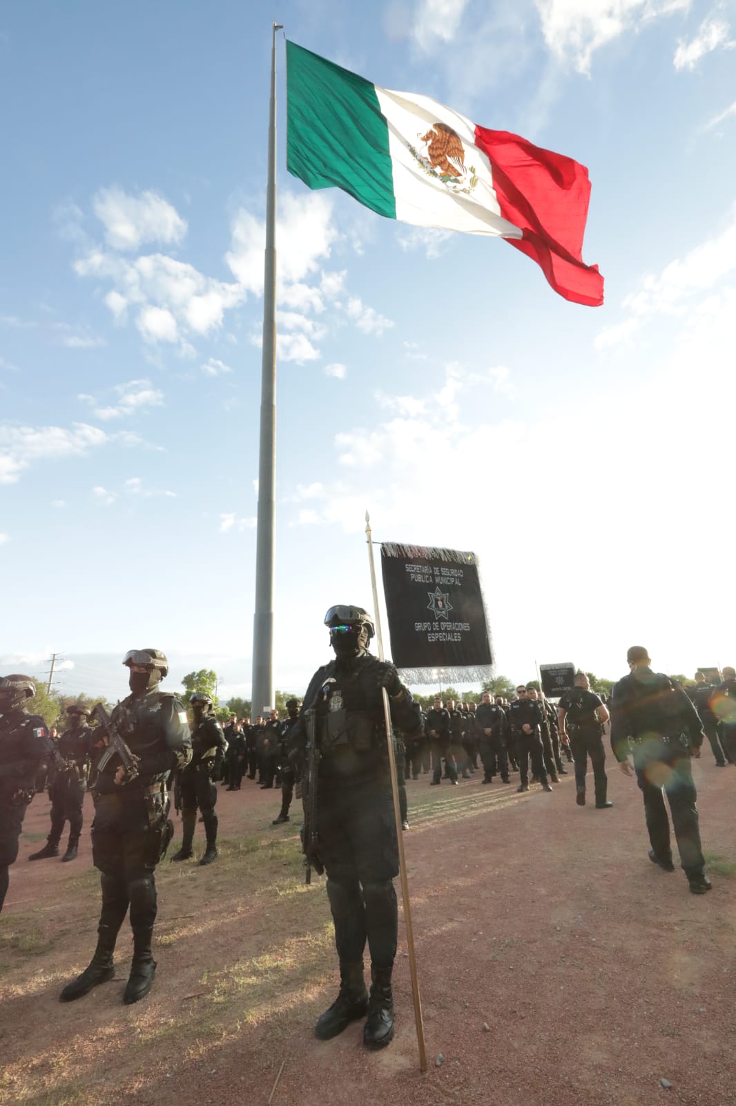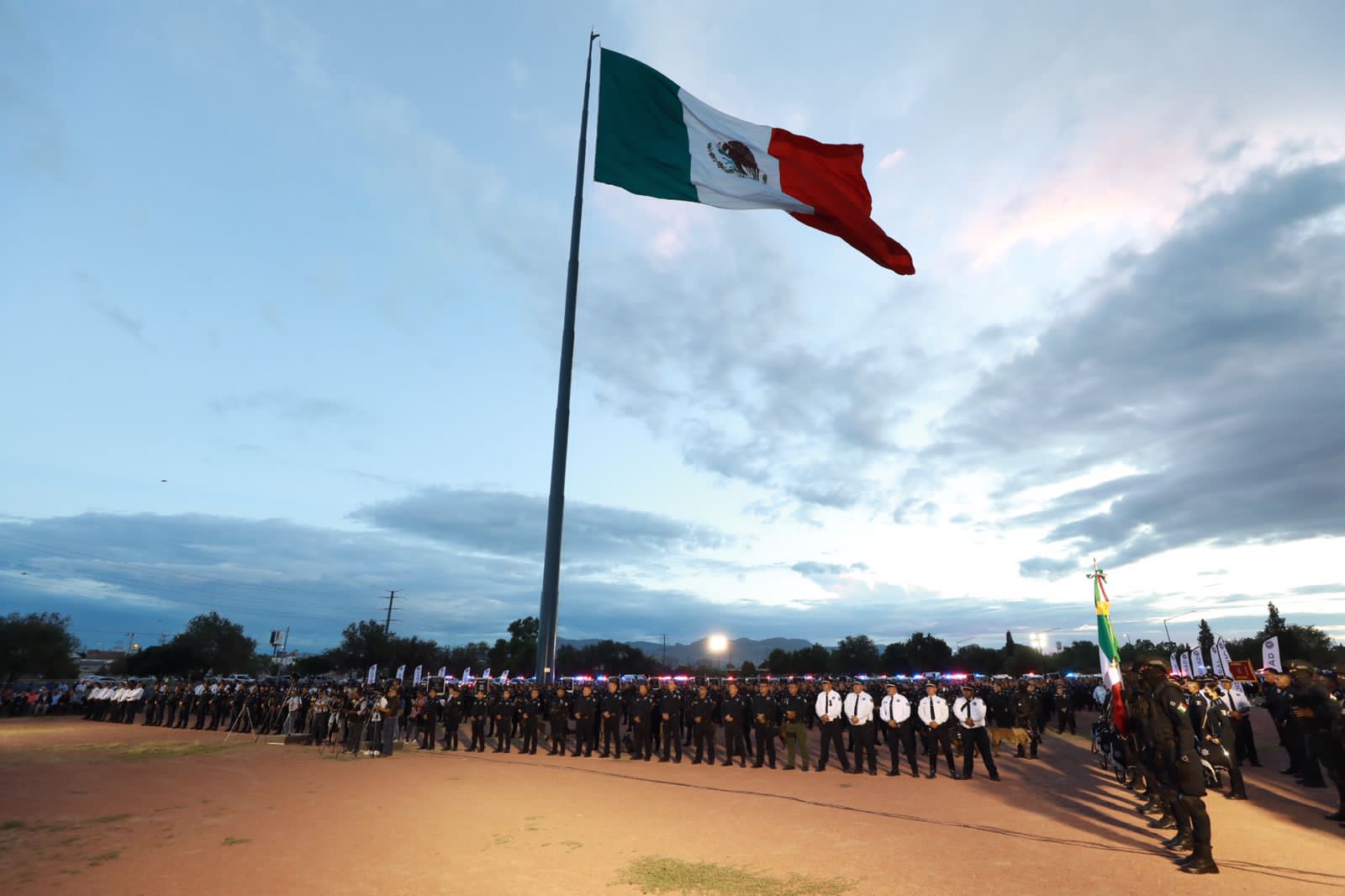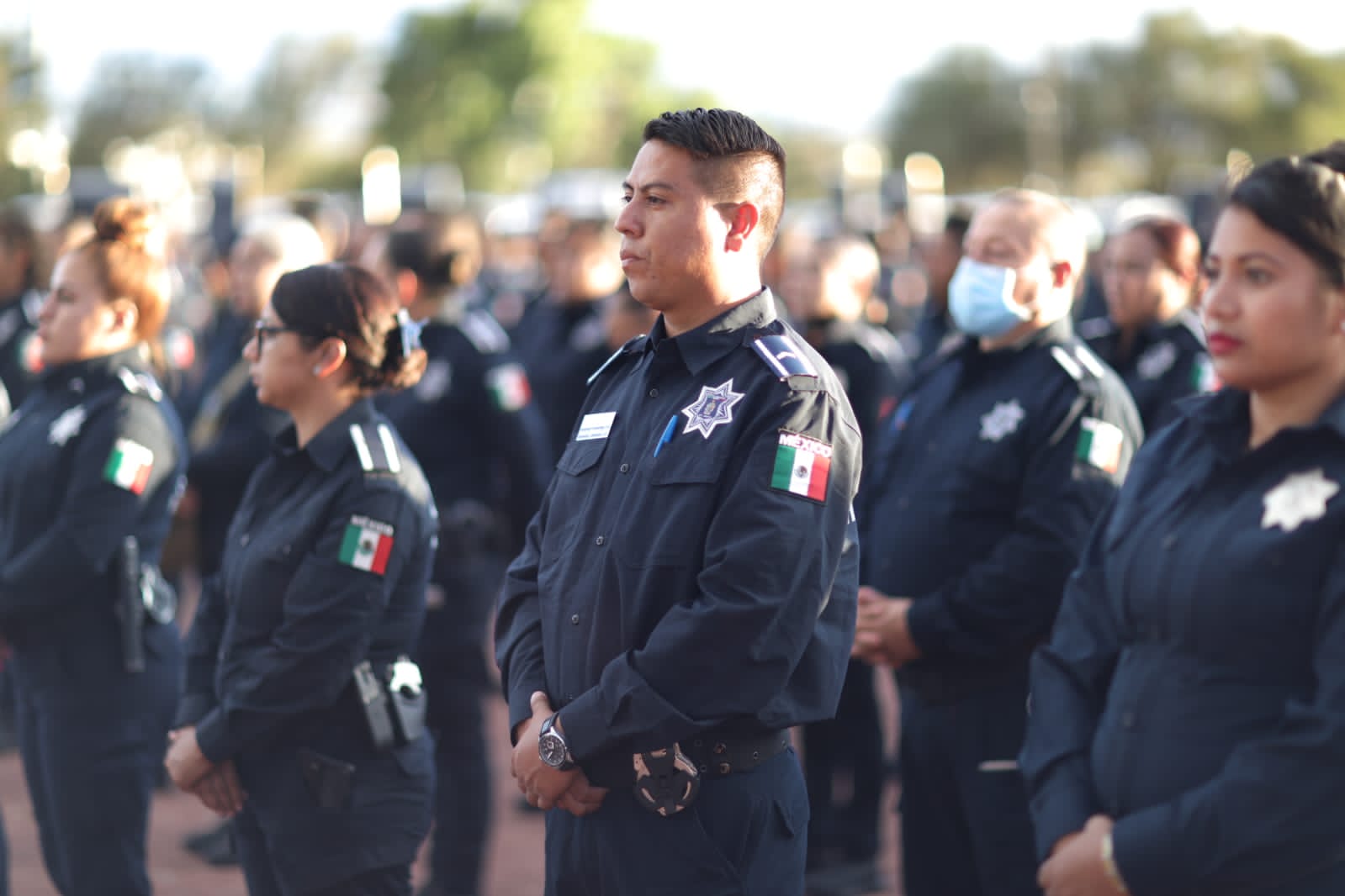 En el acto que tuvo lugar en la explanada de la Mega Bandera, el alcalde estuvo acompañado de los mandos de la Secretaría de Seguridad Pública Municipal y Coordinación de Seguridad Vial con quienes se dirigió a saludar a las tropas de la Policía Municipal y Vialidad que conformaron un cuadro solemne para escuchar el mensaje oficial.