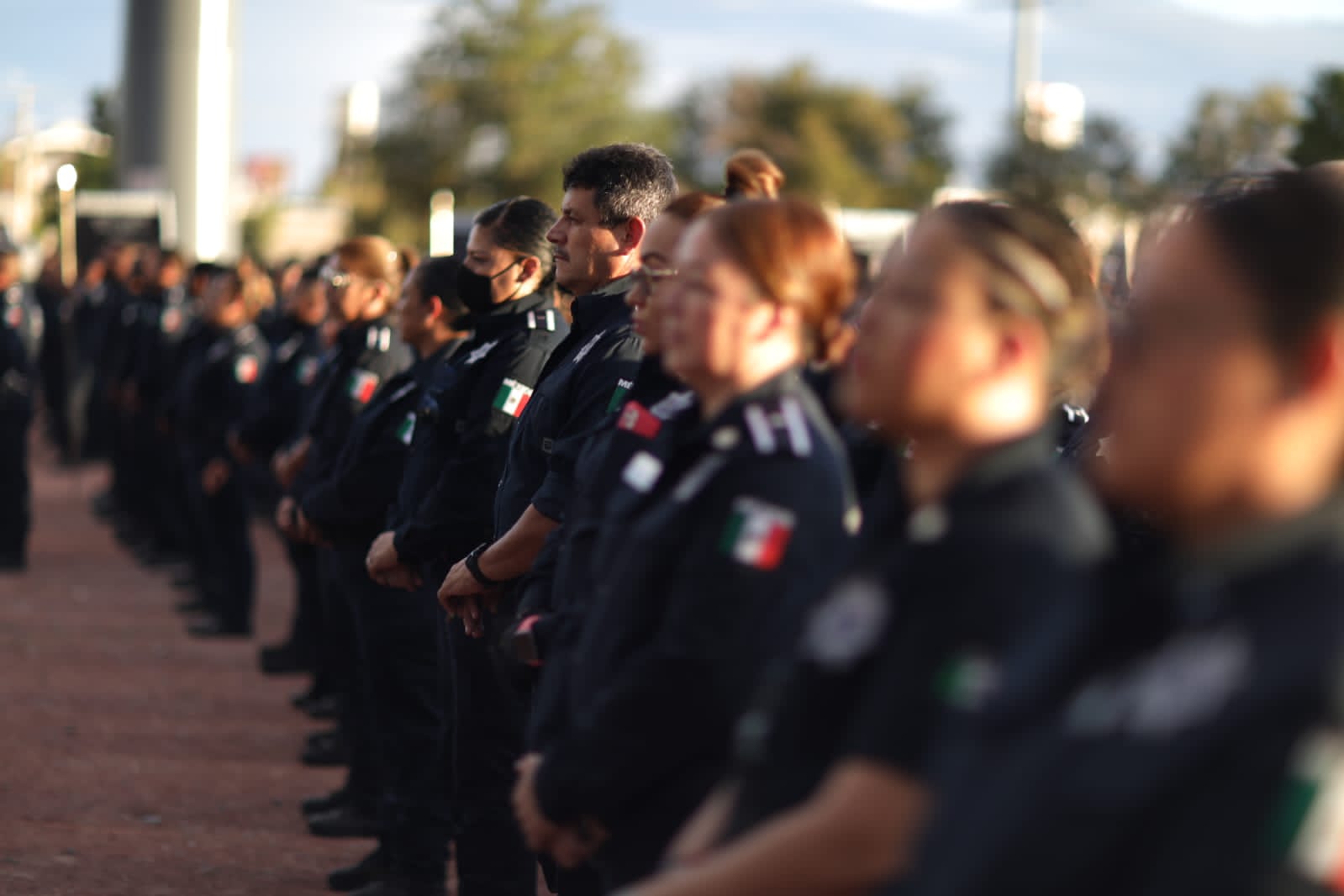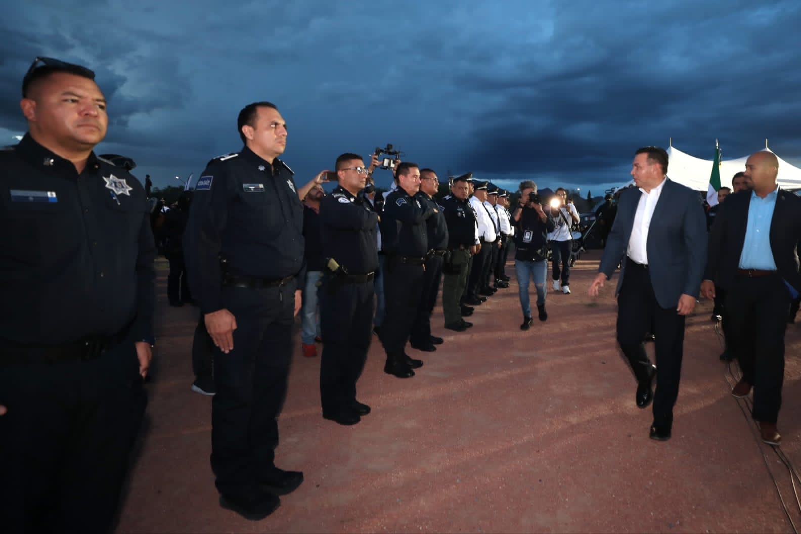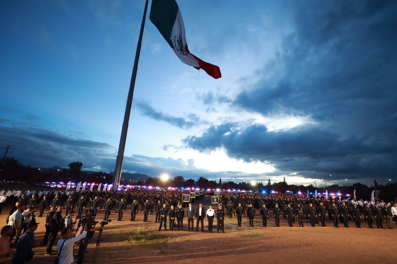En el acto que tuvo lugar en la explanada de la Mega Bandera, el alcalde estuvo acompañado de los mandos de la Secretaría de Seguridad Pública Municipal y Coordinación de Seguridad Vial con quienes se dirigió a saludar a las tropas de la Policía Municipal y Vialidad que conformaron un cuadro solemne para escuchar el mensaje oficial.