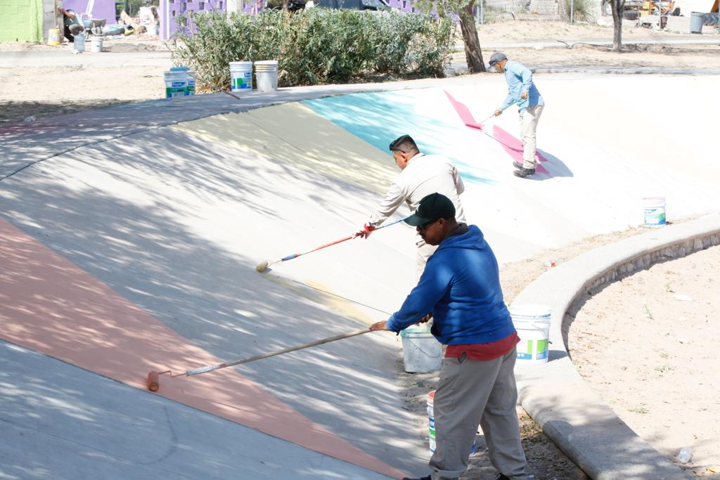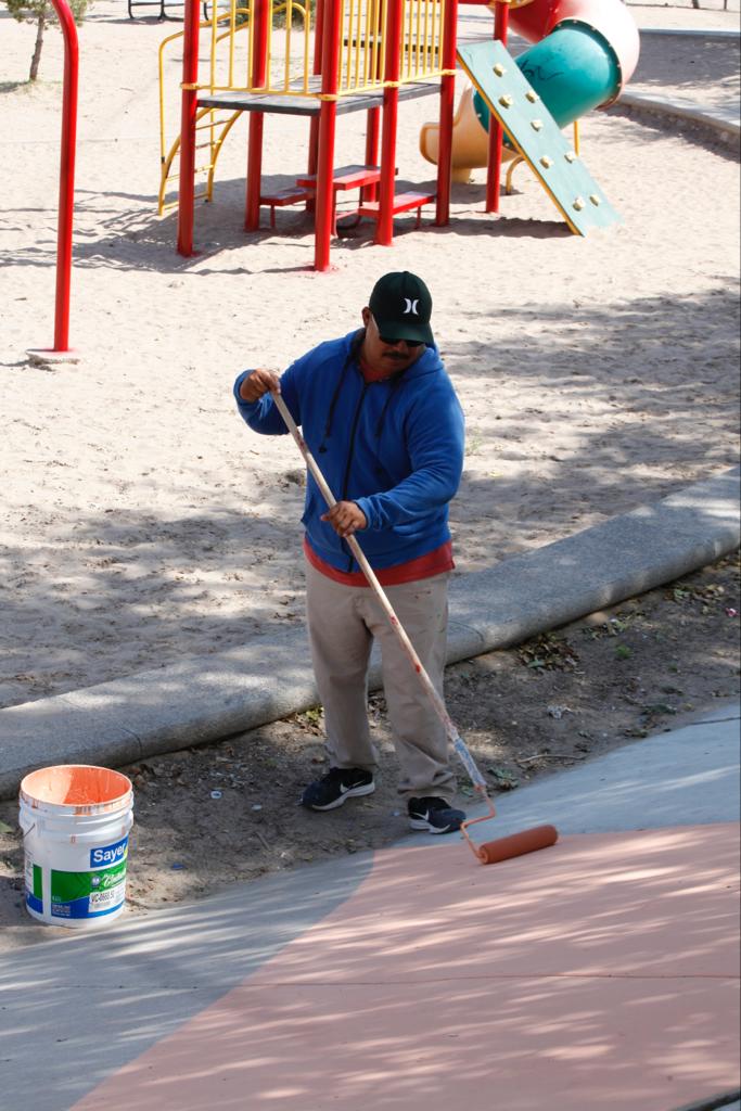 Solís detalló que 112 colaboradores de la dependencia trabajan con el levantamiento de tierra de arrastre, además la cuadrilla antigrafiti labora en la pintura de área de juegos y canchas.