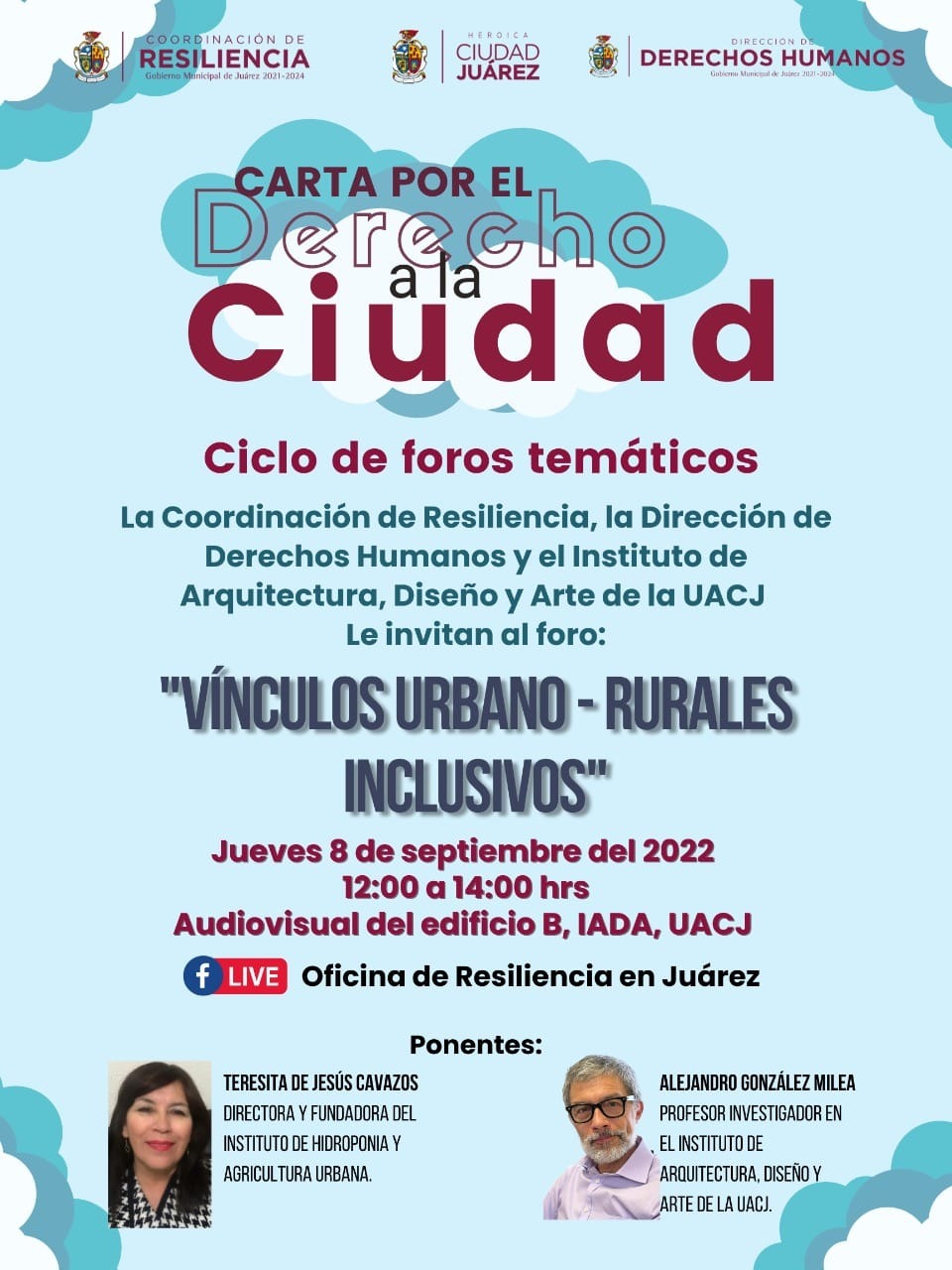 Mañana jueves se llevará a cabo el quinto foro temático hacia la creación de la Carta por el Derecho a la Ciudad, con el tema ??Vínculos urbano-rurales inclusivos?, evento que se llevará a cabo en el Instituto de Arquitectura, Diseño y Arte (IADA) de la Universidad Autónoma de Ciudad Juárez (UACJ).