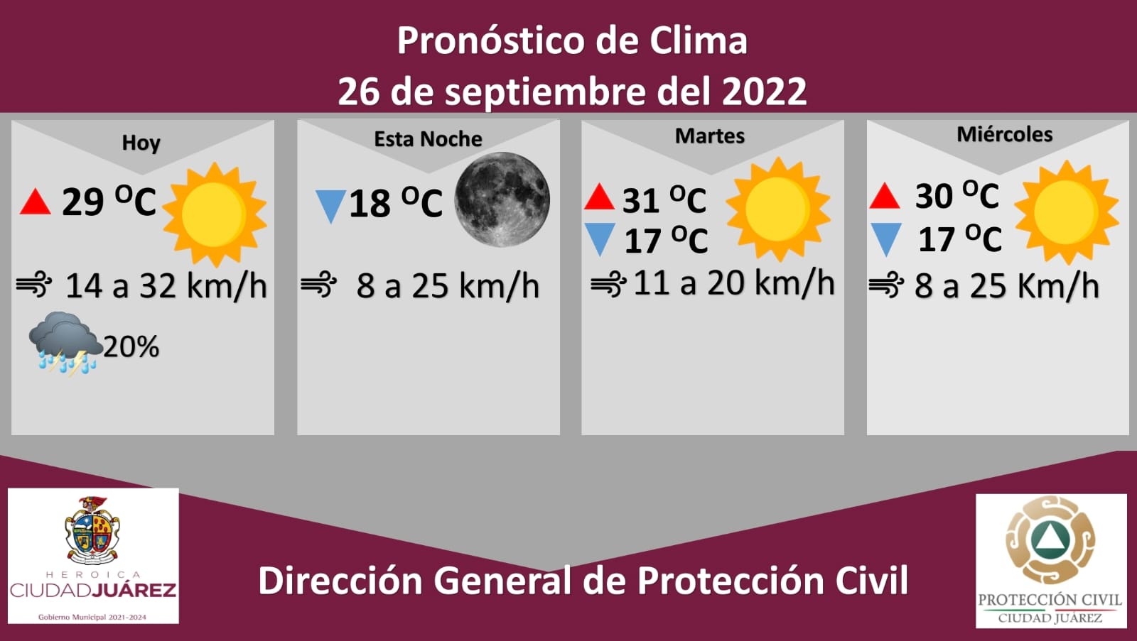 El miércoles será soleado, con una temperatura máxima de 30 °C y mínima de 17 °C, el viento oscilará de 8 a 25 kilómetros por hora.