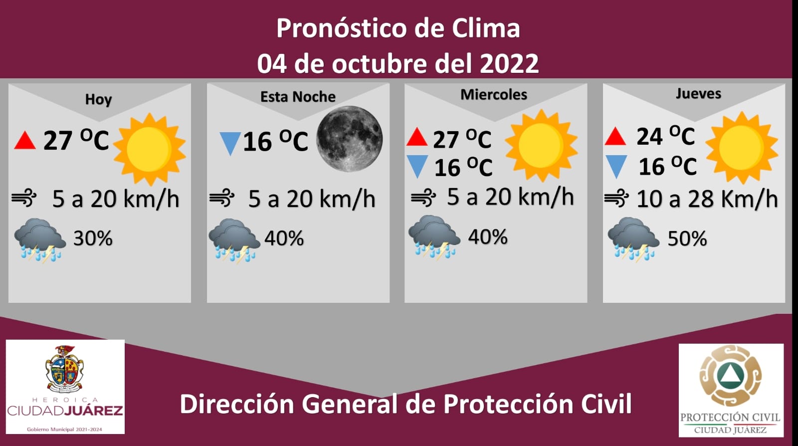 El jueves la probabilidad de lluvia será de un 50 por ciento, la temperatura máxima se espera en 24 °C y la mínima en los 16 °C, en tanto que la velocidad del viento oscilará de 10 a 28 kilómetros por hora.