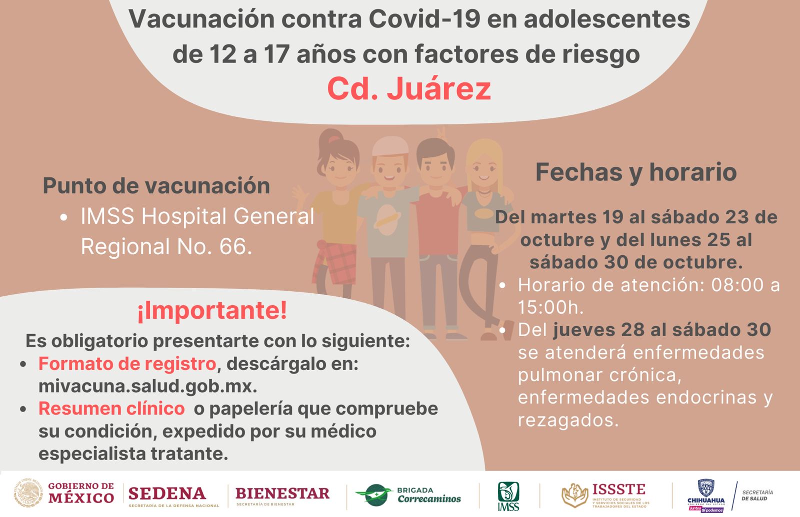 El Gobierno Municipal 2021-2024 hace un atento llamado a los padres de familia o tutores de adolescentes con factores de riesgo, a que acudan a vacunarlos contra el COVID-19 en la Jornada de Vacunación para personas de 12 a 17 años de edad que se implementa en Ciudad Juárez por parte del Gobierno Federal.