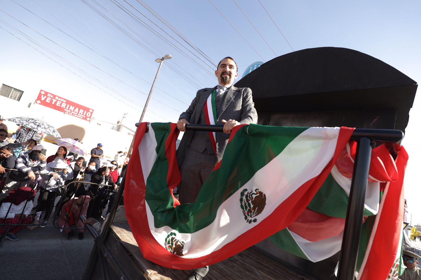 Los juarenses observaron a un joven caracterizado de Francisco I. Madero sobre un carro de ferrocarril saludando a los presentes.