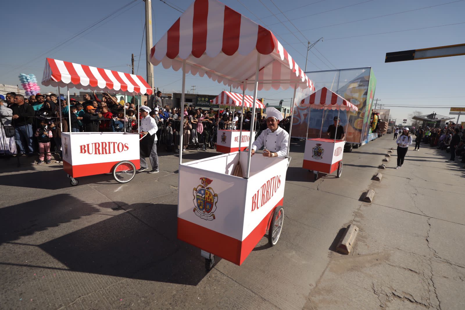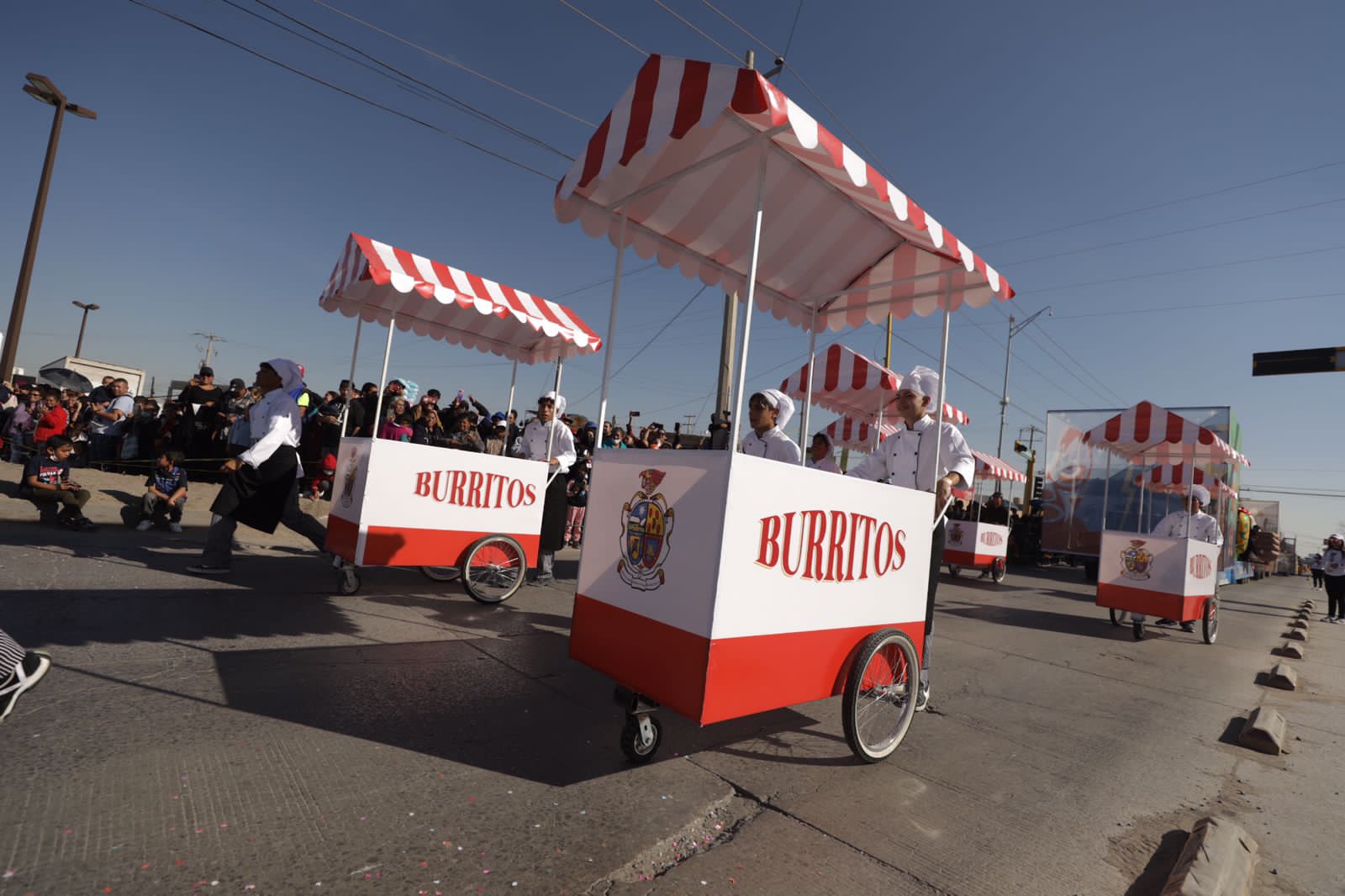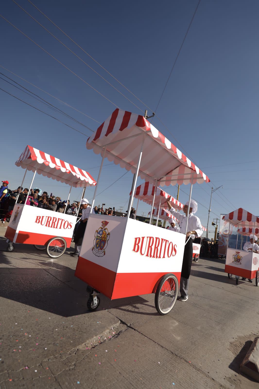 Los famosos ??burritos?, comida típica de esta frontera, hicieron su aparición en el Primer Gran Desfile Conmemorativo por el 363 aniversario de Ciudad Juarez, acompañados de la Banda Municipal y un carro alegórico representando el orgullo juarense.