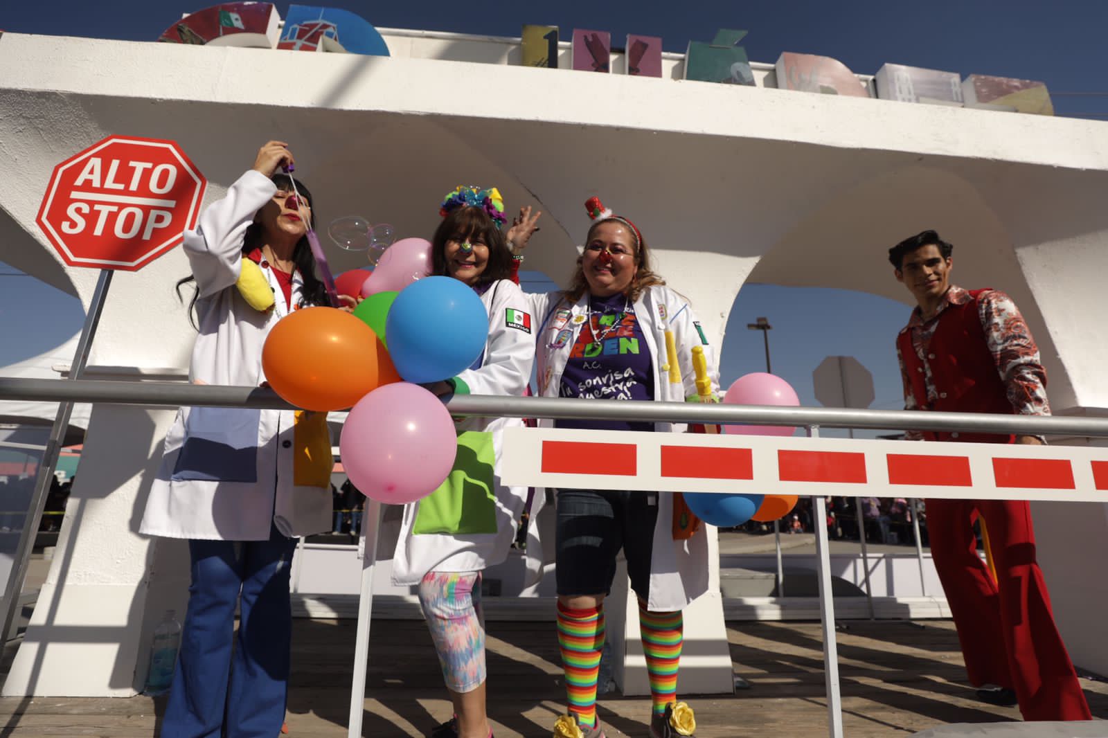 Adornado con los puentes internacionales de la frontera, en el carro viajaban personajes como el cantante Juan Gabriel, los doctores de la risa y otros personajes.